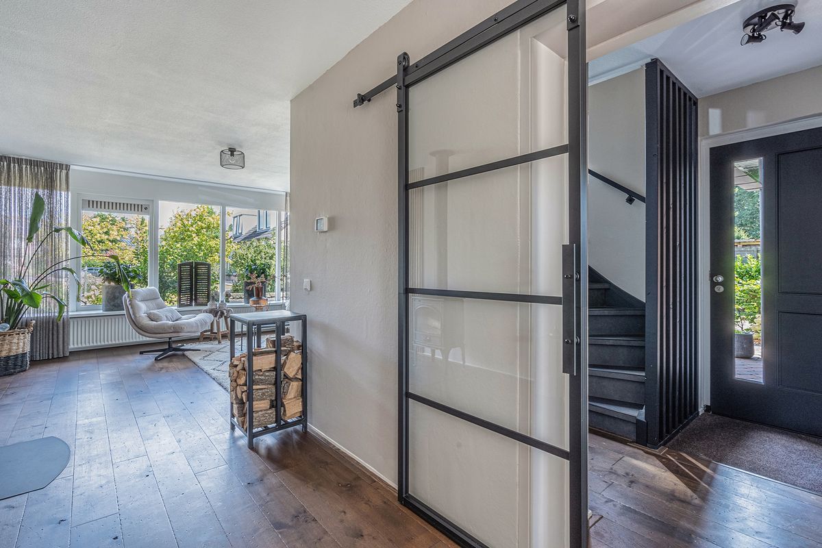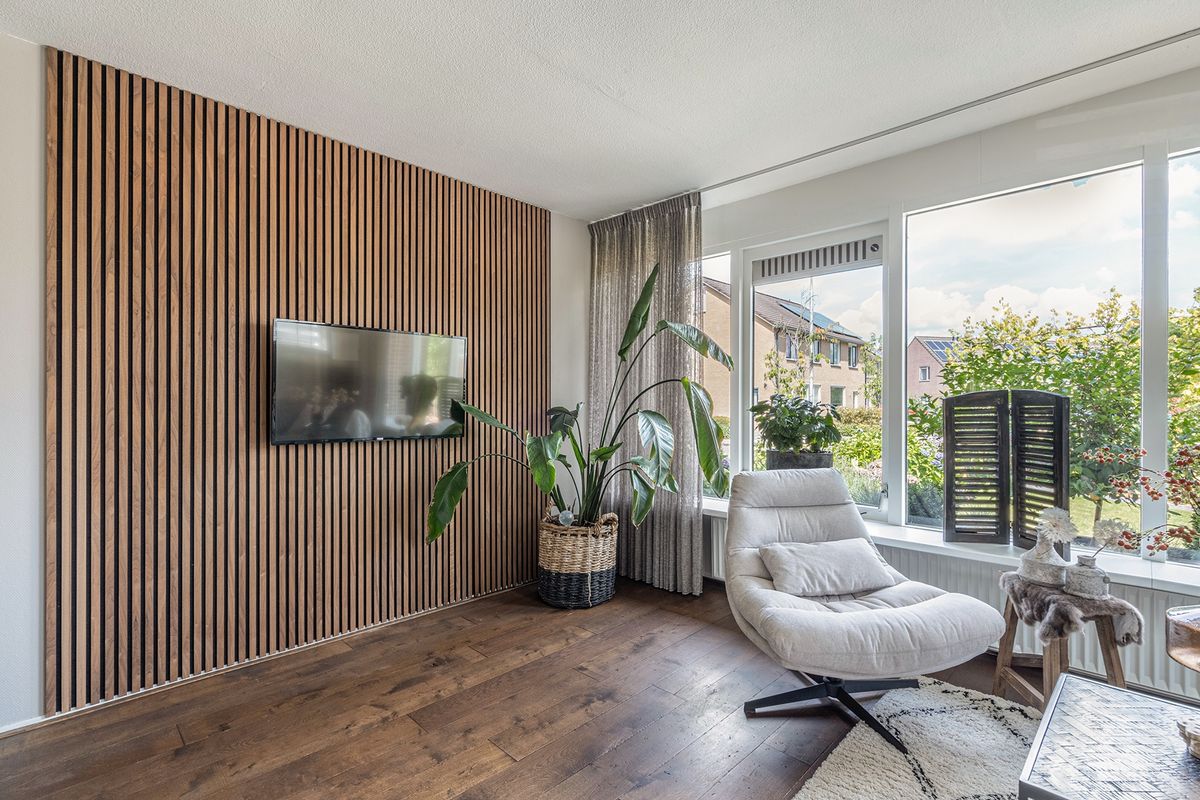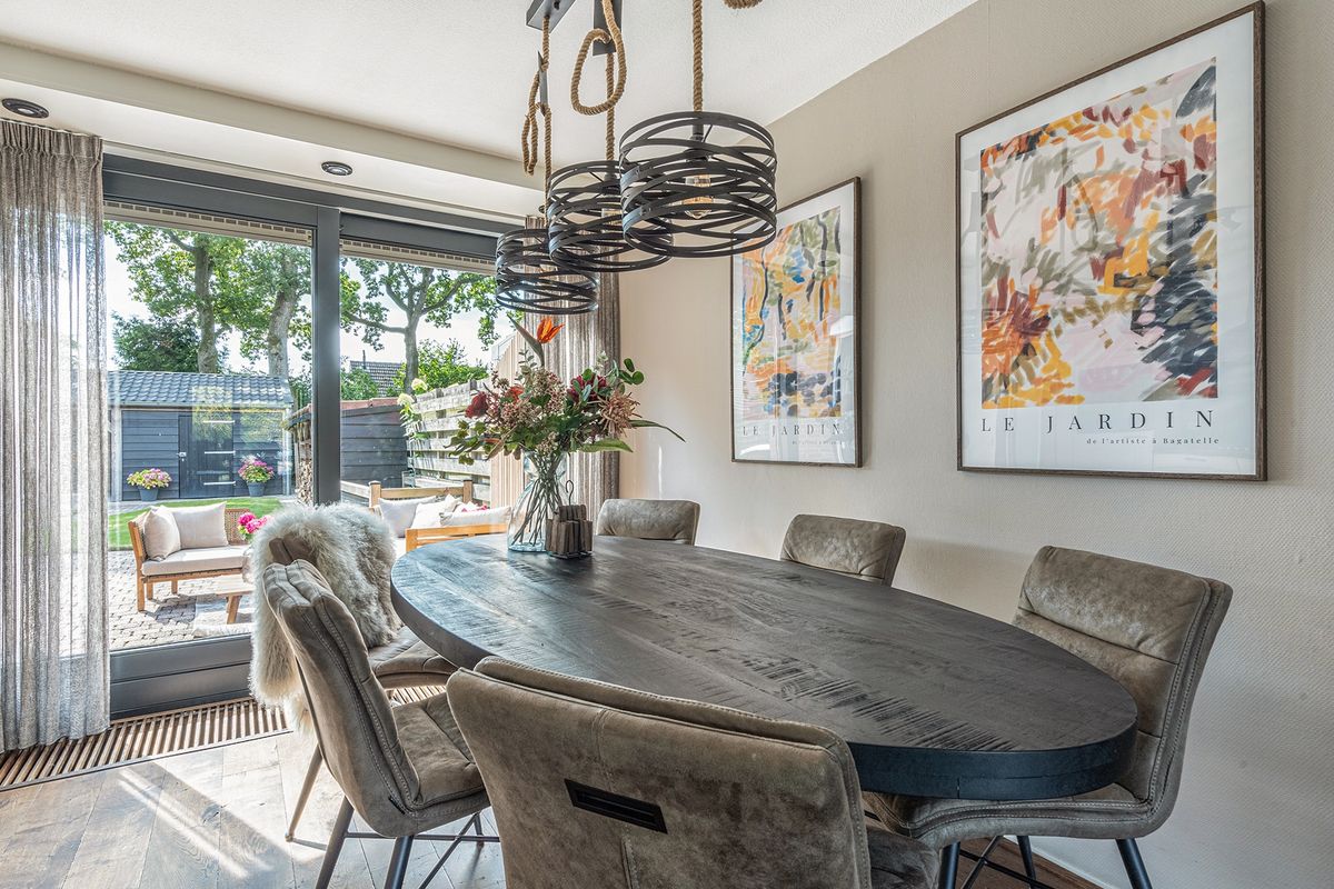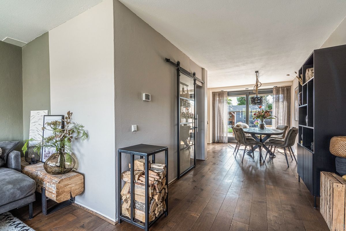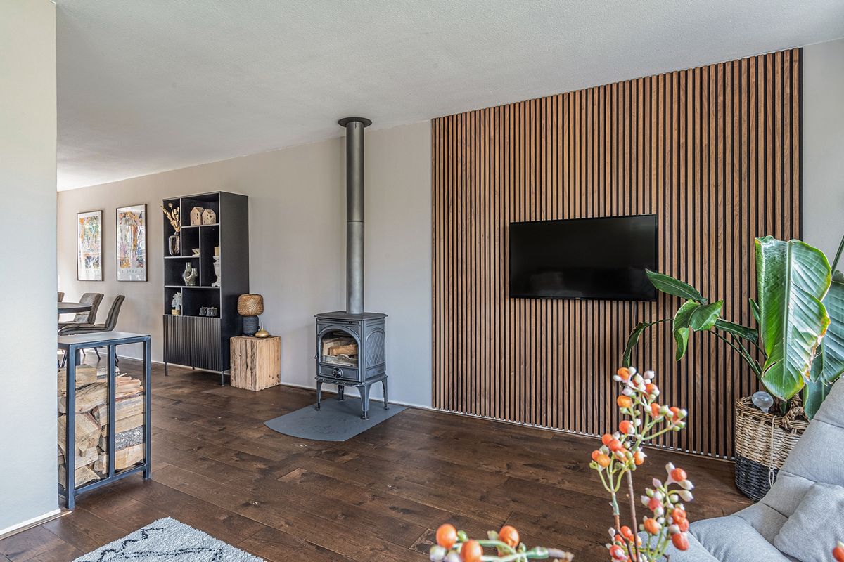 • Sfeervolle woonkamer met houtkachel en schuifpui naar de tuin