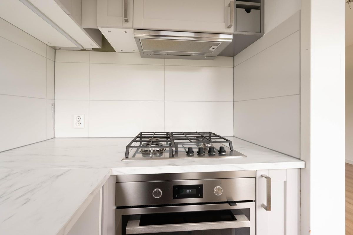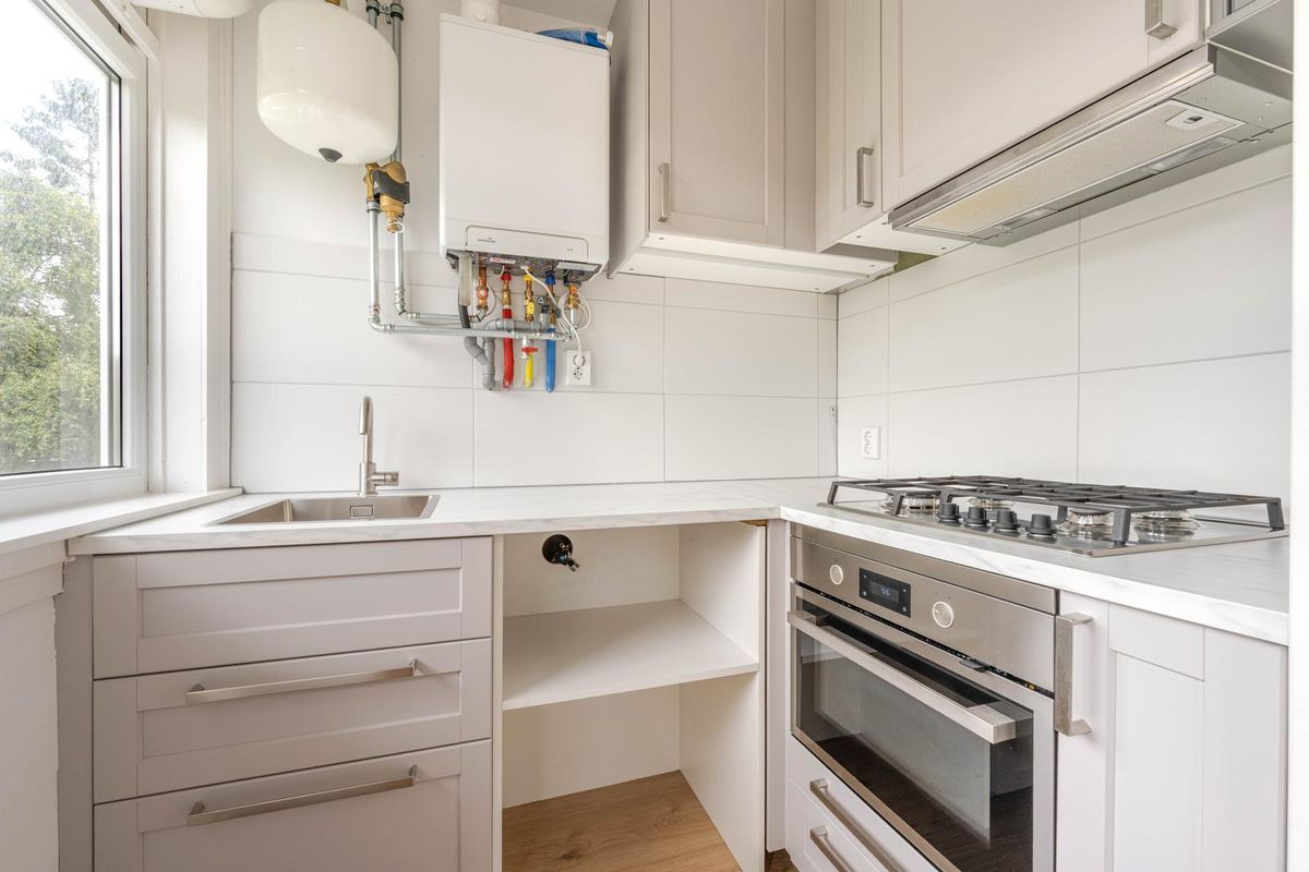 * Open keuken aan de achterzijde met hoekinbouwkeuken inbouwapparatuur: gaskookplaat, combimagnetron, afzuigkap en opstelling van de C.V.-ketel.