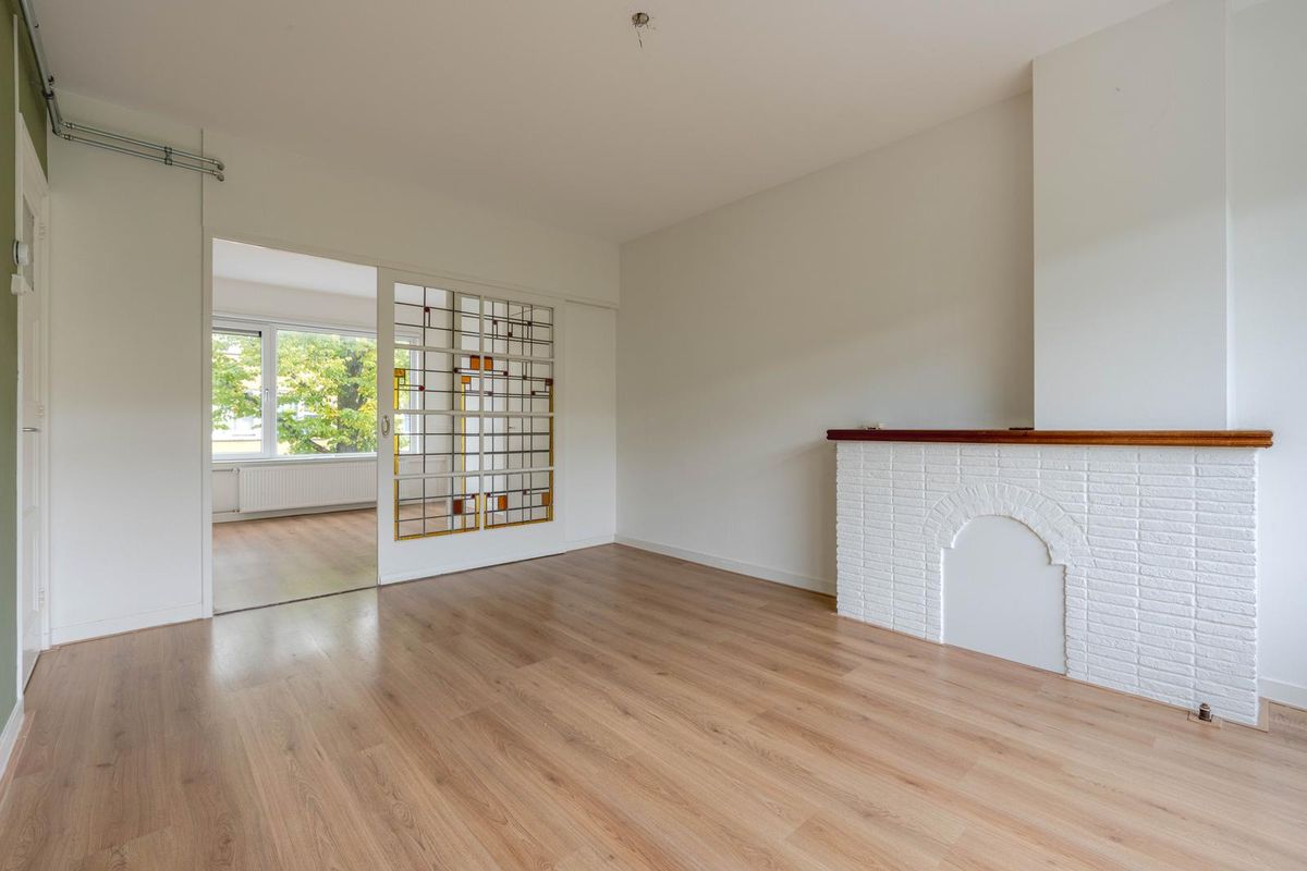 * Woonkamer aan de achterzijde voorzien van laminaatvloer, schouw, schuifdeuren met glas in lood, open verbinding met de keukenruimte en toegang tot het balkon.