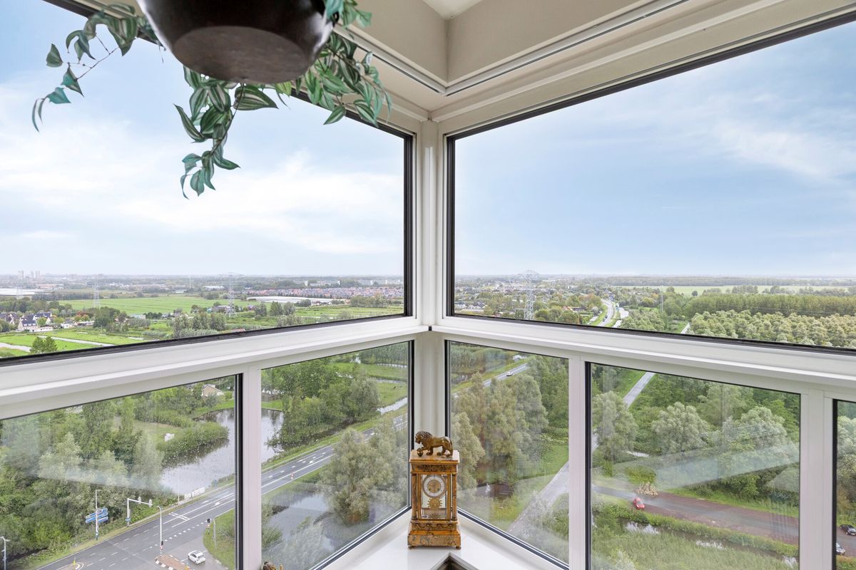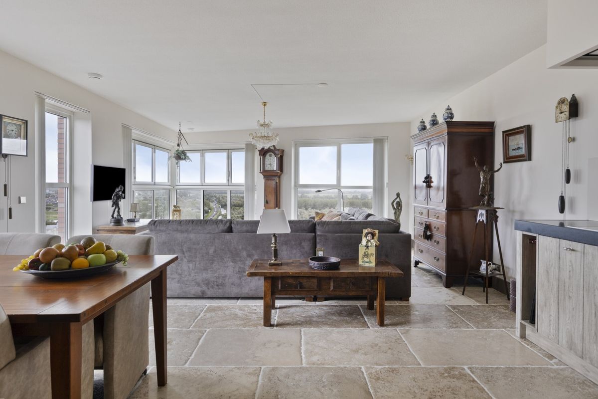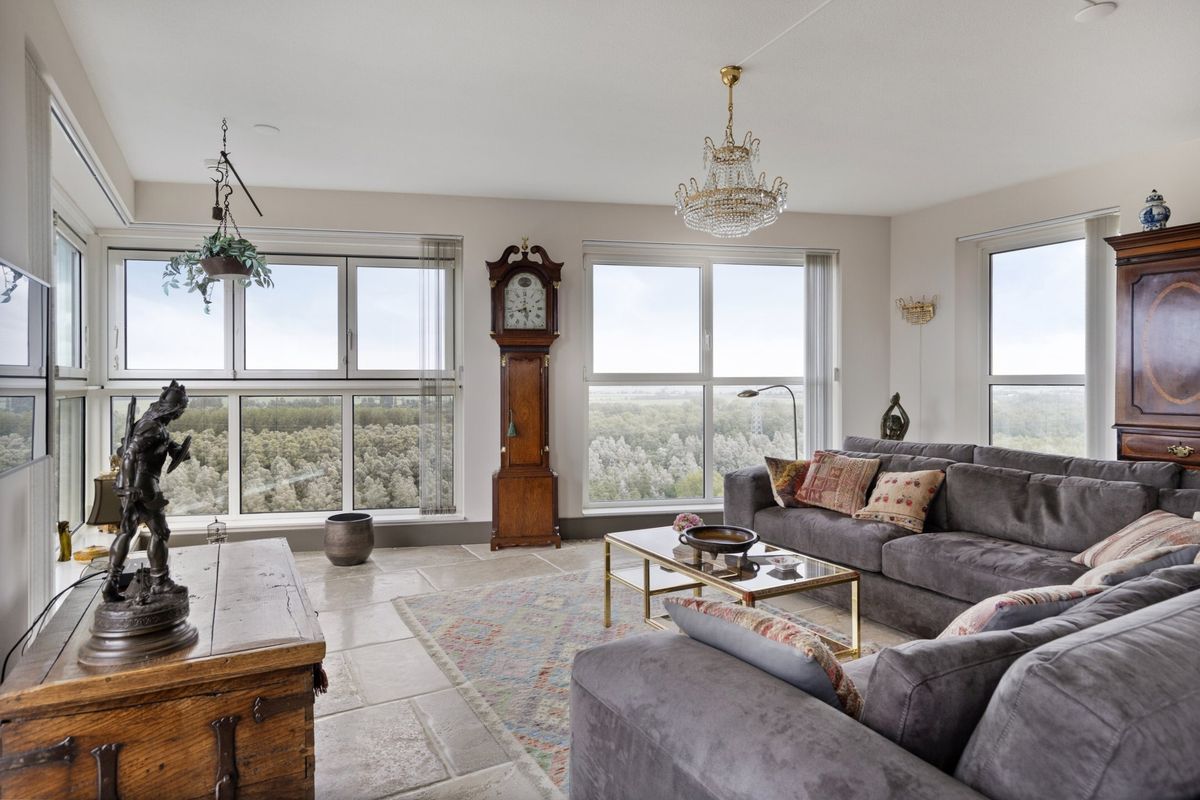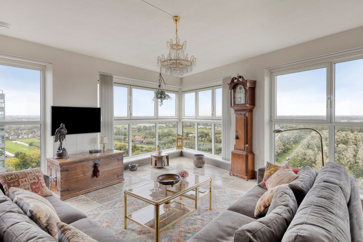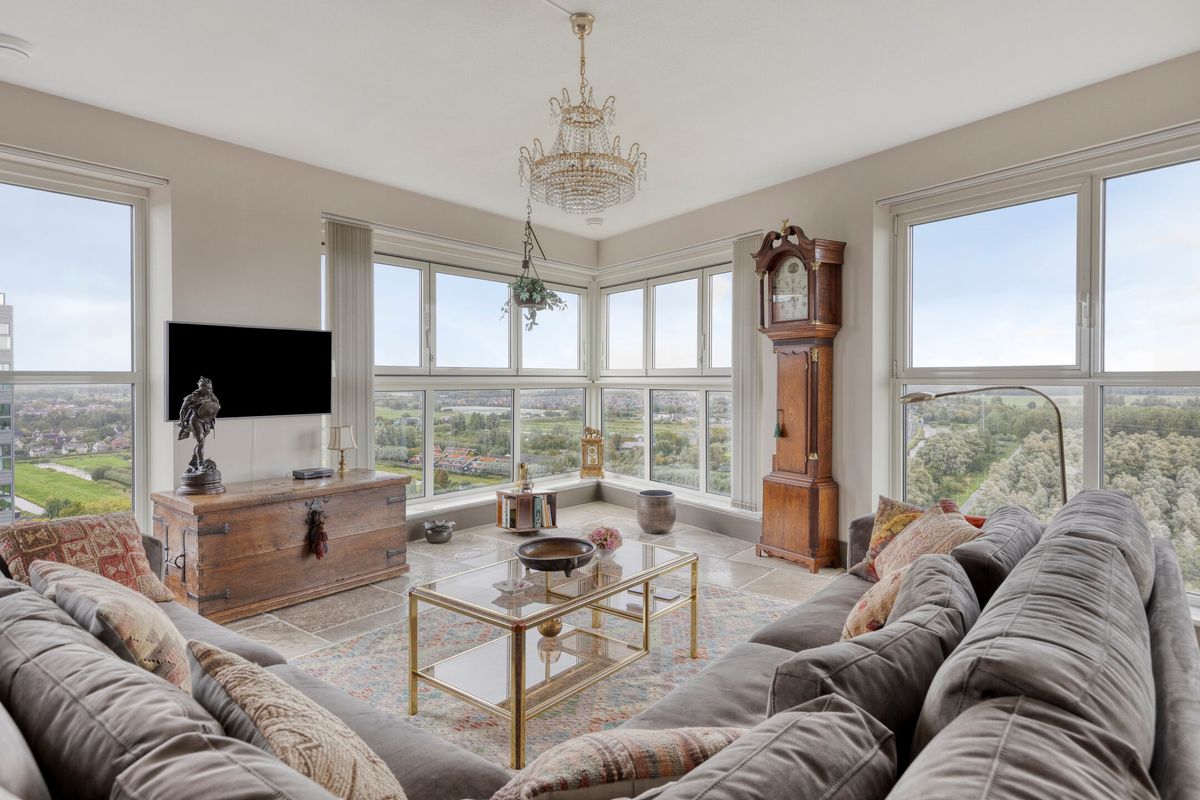 Woonkamer, een royale woonkamer met werkelijk heel fraai en weids uitzicht naar verschillende kanten: Natuurgebied Park Hitland, Krimpenerwaard en Gouda en Den Haag/Scheveningen.