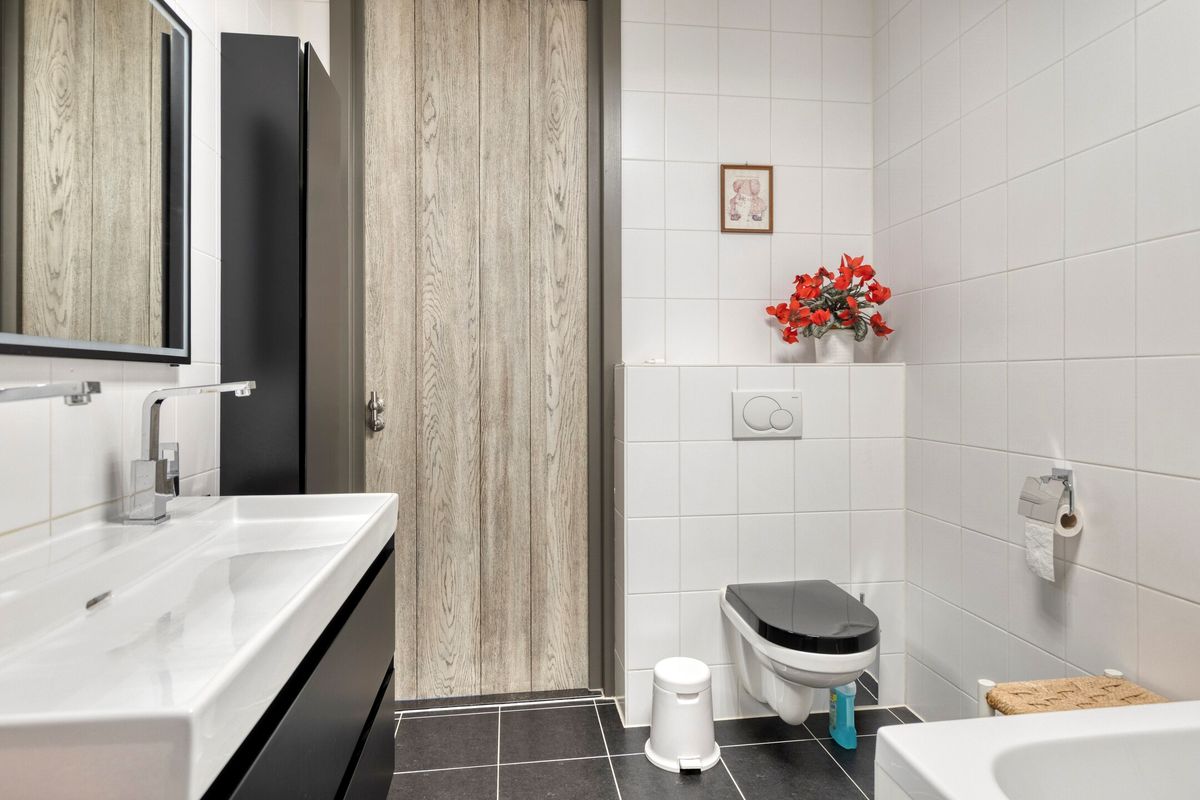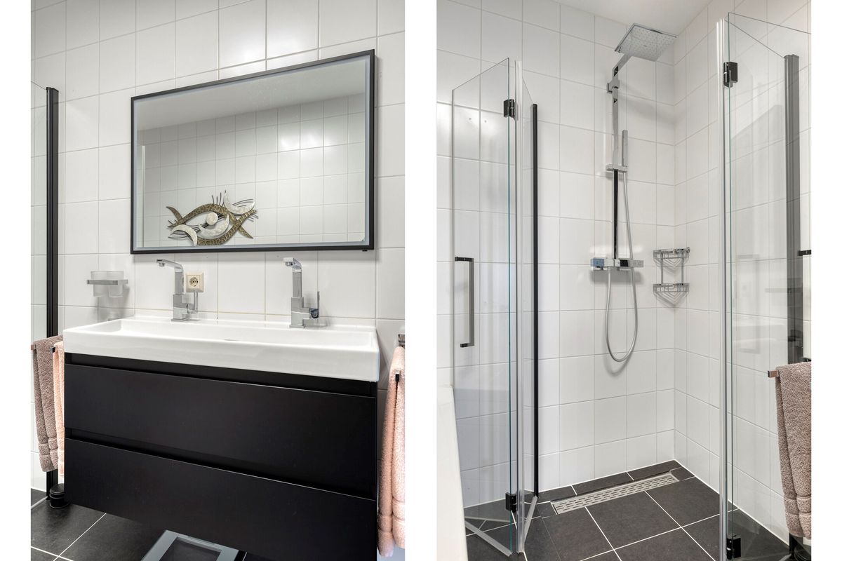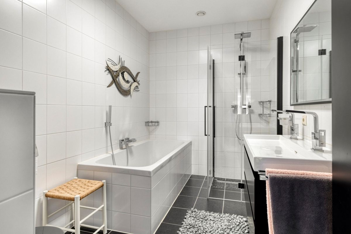 Badkamer, een geheel betegelde ruimte, voorzien van groot ligbad met thermostaatkraan en handdouche, separate douchehoek met douchescherm en rainshower, een tweede toilet (hangend closet) en een brede wastafel met 2 mengkranen, onderladen en een spiegel met verlichting.