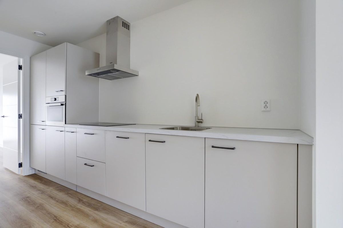 De open keuken is modern ingericht en voorzien van een inductiekookplaat, afzuigkap, combi-oven, koelkast, vriezer, vaatwasser en strakke, greeploze witte fronten. De opstelling zorgt voor veel werk- en kastruimte.