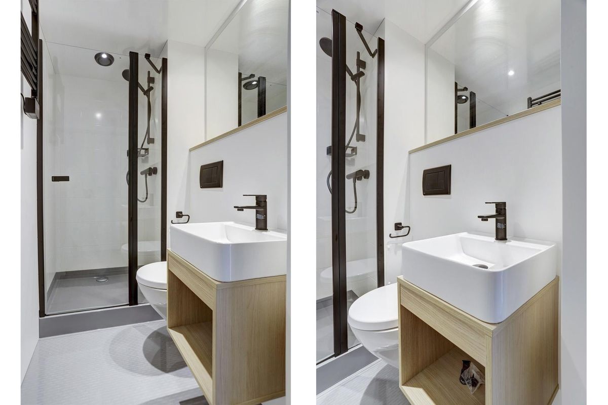 De badkamer is modern en luxe afgewerkt, met een stijlvolle douchecabine met glazen wand, wastafelmeubel, toilet en zwarte accenten die zorgen voor een eigentijdse uitstraling.