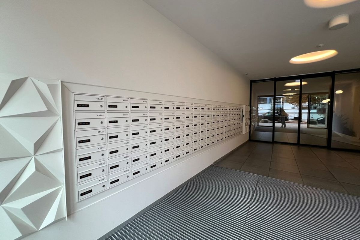 The communal hall/entrance with doorbells provides access to the apartments, the elevator installation, the stairwell, bicycle shed, parcel post box, and common areas.