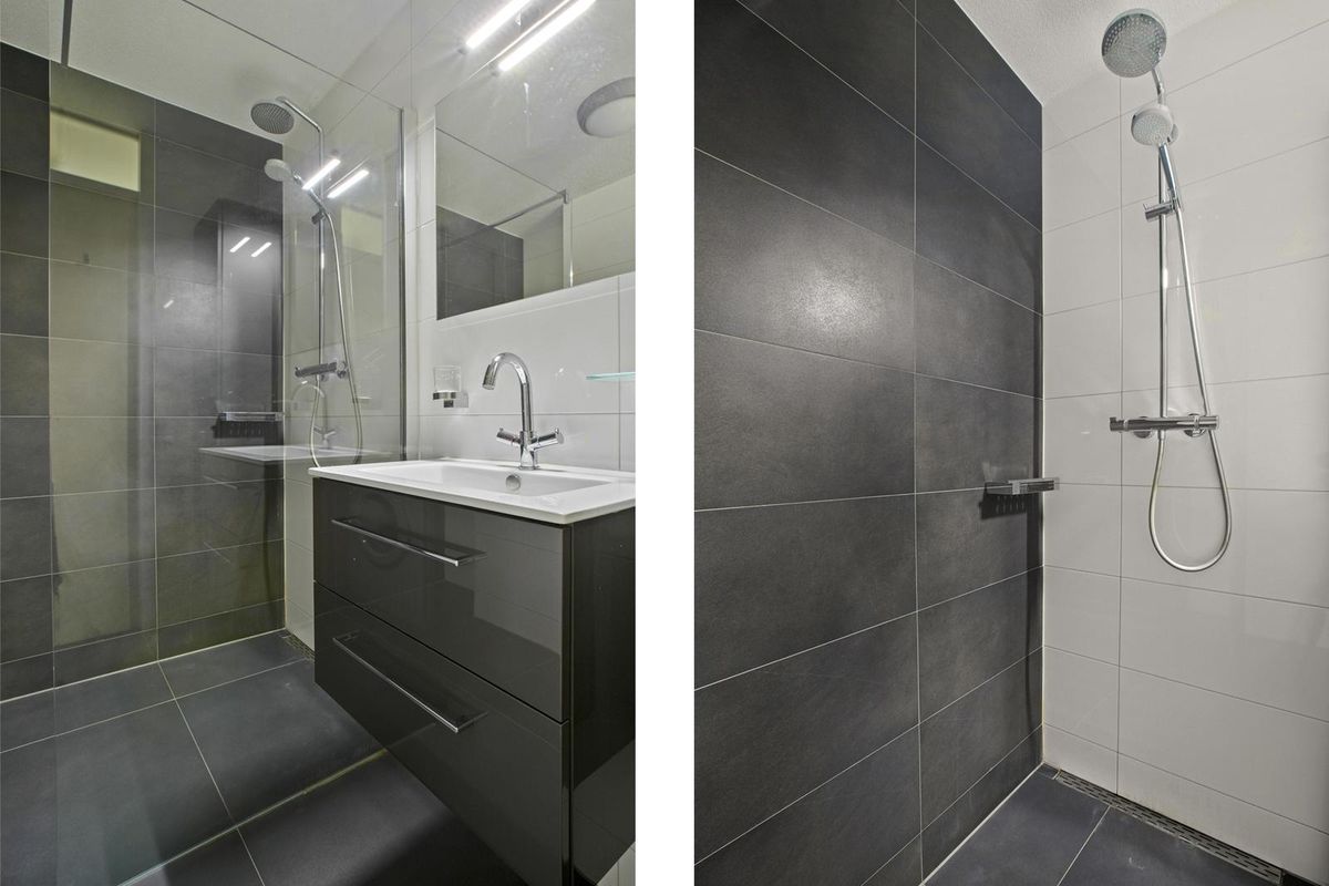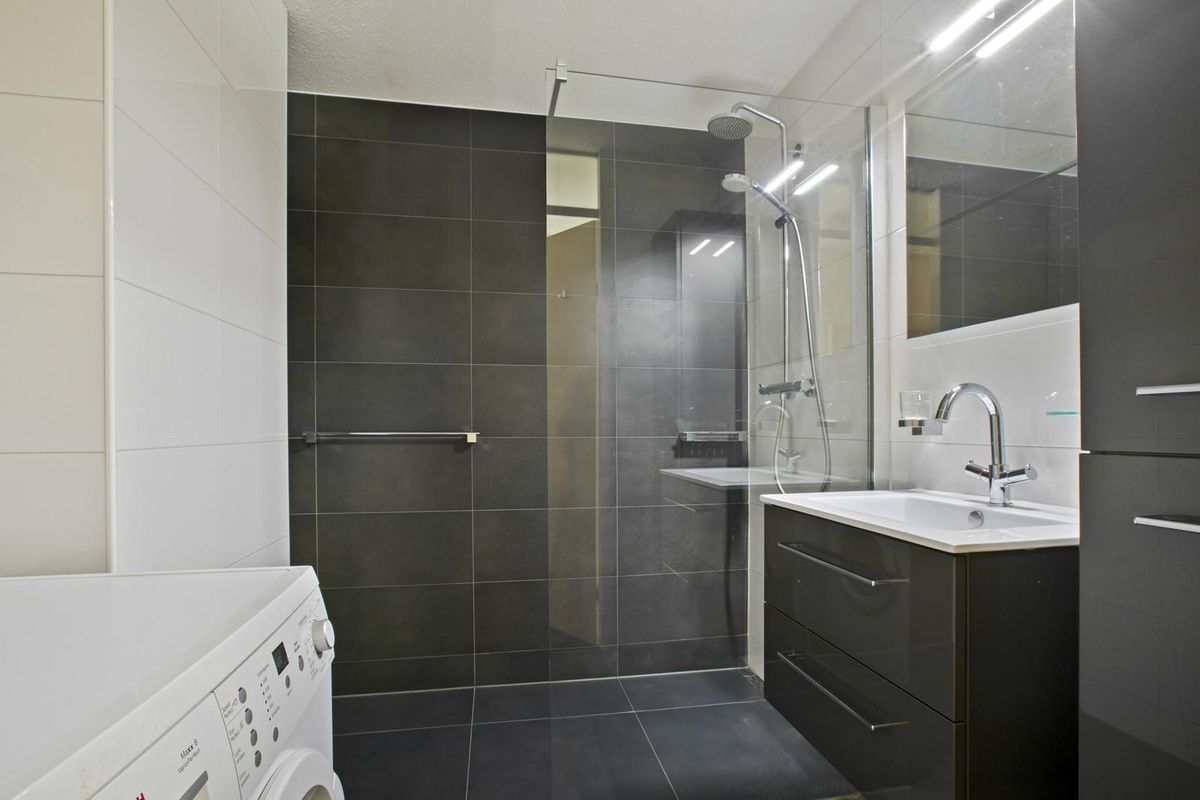 De moderne badkamer is uitgerust met een inloopdouche, wastafelmeubel en aansluiting voor de wasmachine. Separaat is er een toilet met fonteintje.