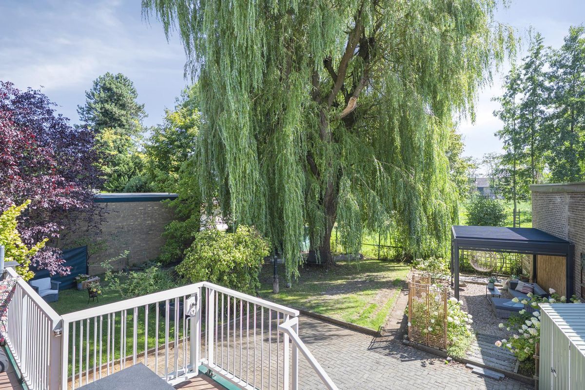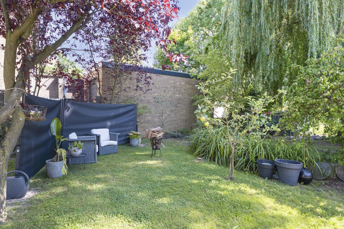 De fraai aangelegde tuin is volledig omheind en biedt optimale privacy. Je vindt er een berging, toegang tot de garage en een luxe overkapping met lamellendak en screens. Via een stenen trap bereik je het zonneterras, dat direct aansluit op de woonkamer.