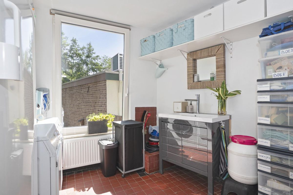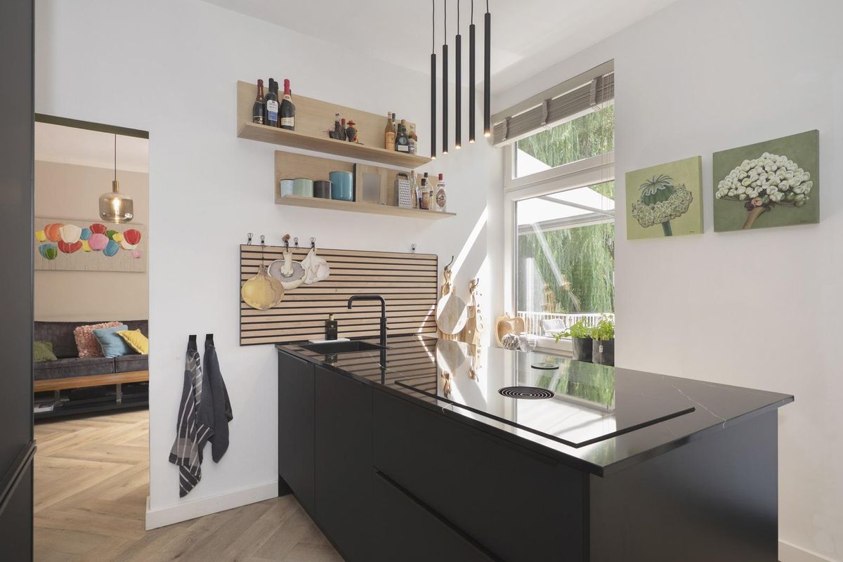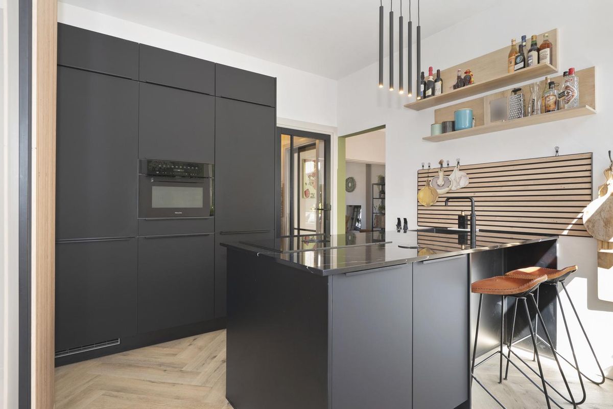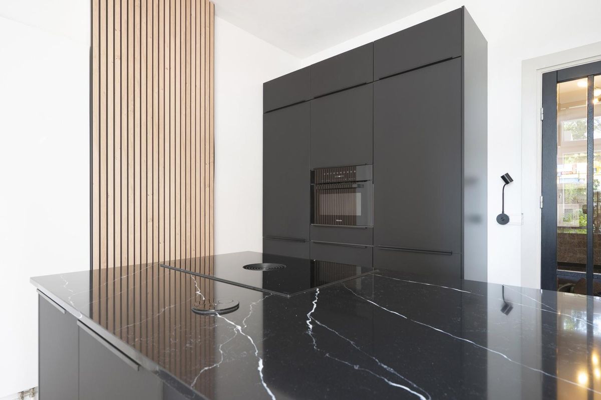 Grenzend aan de woonkamer ligt de moderne keuken met kookeiland, uitgerust met luxe inbouwapparatuur zoals een inductiekookplaat met Bora-afzuiging, koel-vriescombinatie, Quooker, vaatwasser en combi-oven. Aangrenzend bevindt zich de praktische bijkeuken met witgoedaansluitingen en extra deuren naar zowel het terras als het looppad bij de voordeur.
