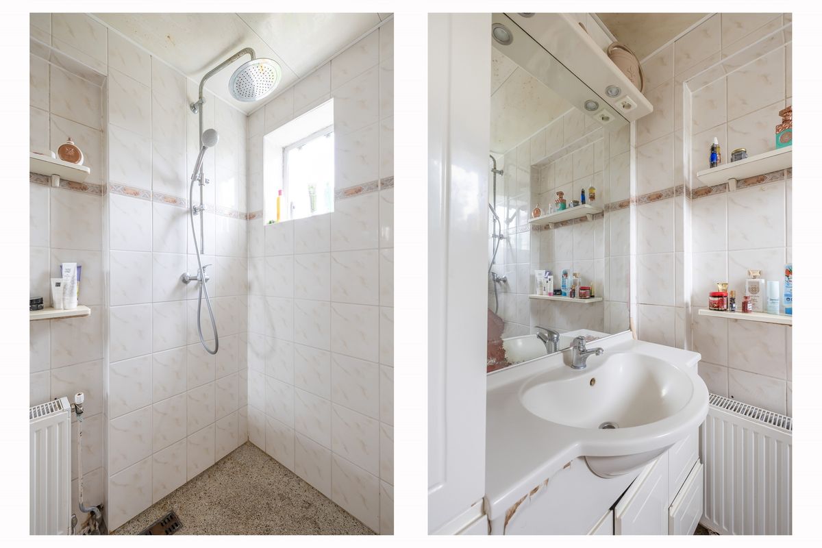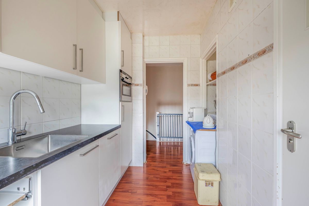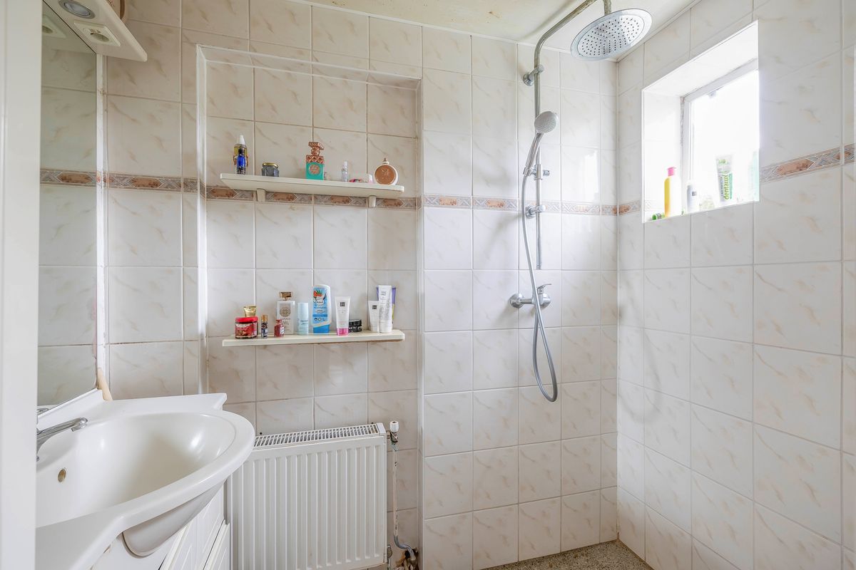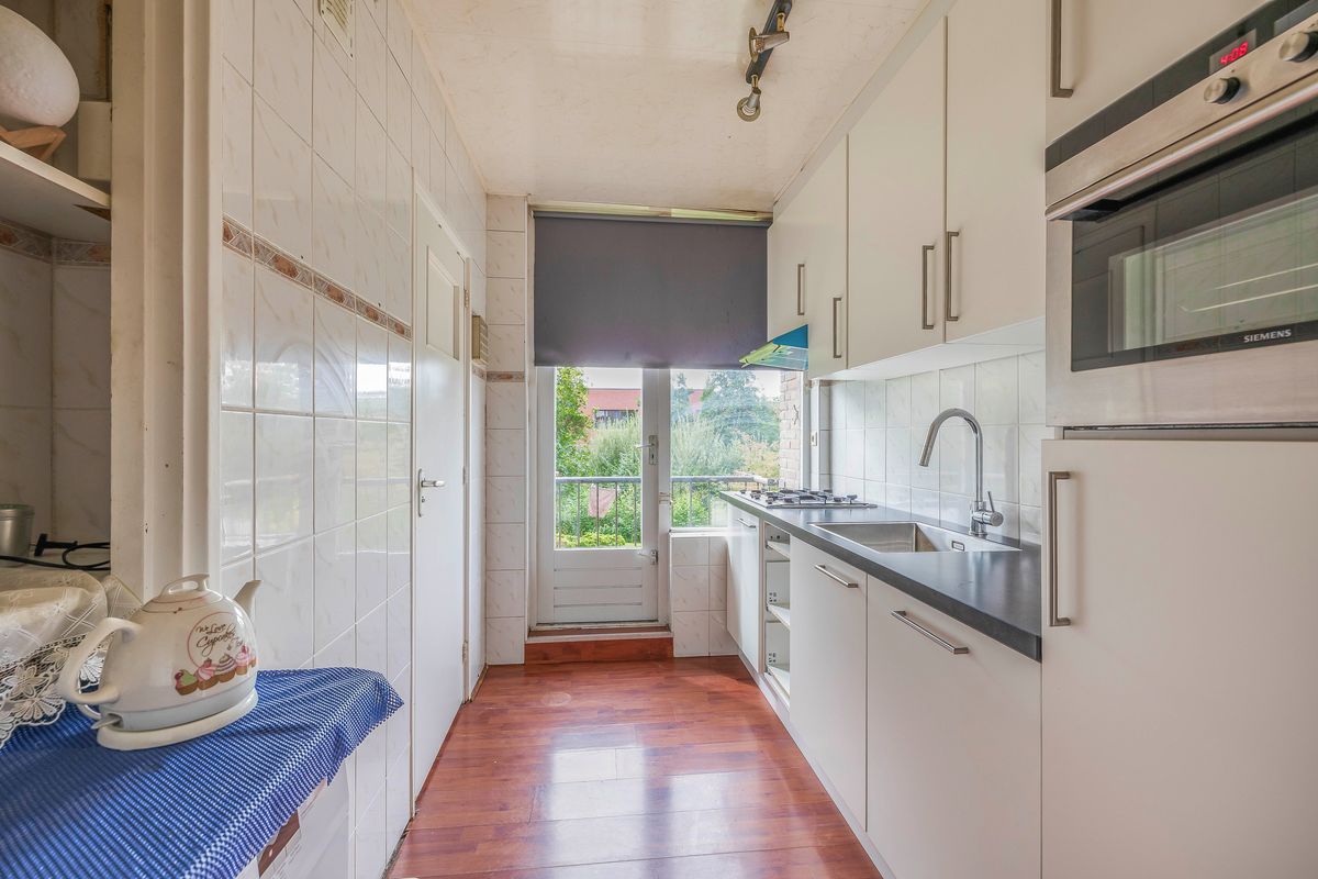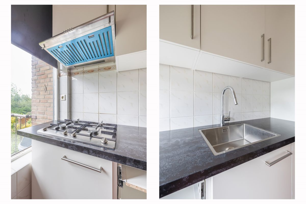Vanuit de hal heb je ook toegang tot de keuken, die een rechte opstelling heeft. De keuken is uitgerust met een vierpits gasfornuis, oven, koelkast en afzuigkap. Ook vind je hier de aansluiting voor de wasmachine. Vanuit de keuken bereik je het balkon dat op het westen ligt. Aangrenzend aan de keuken ligt de geheel betegelde badkamer, voorzien van een douche en een wastafel.