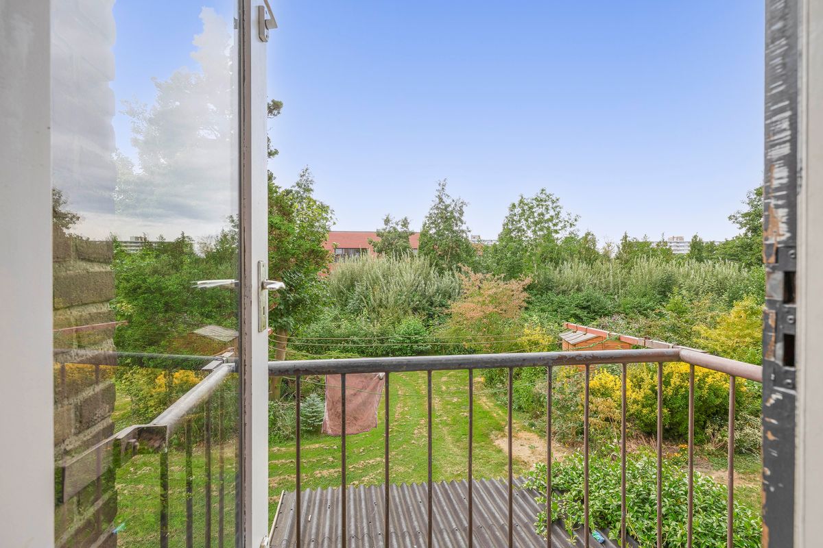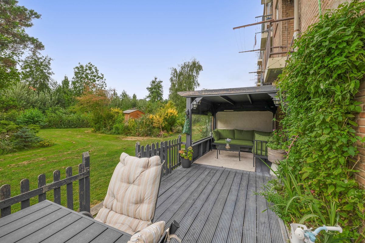 Aan de achterzijde van het complex grenst de woning aan een groene strook met volwassen bomen, wat zorgt voor een gevoel van rust en privacy.