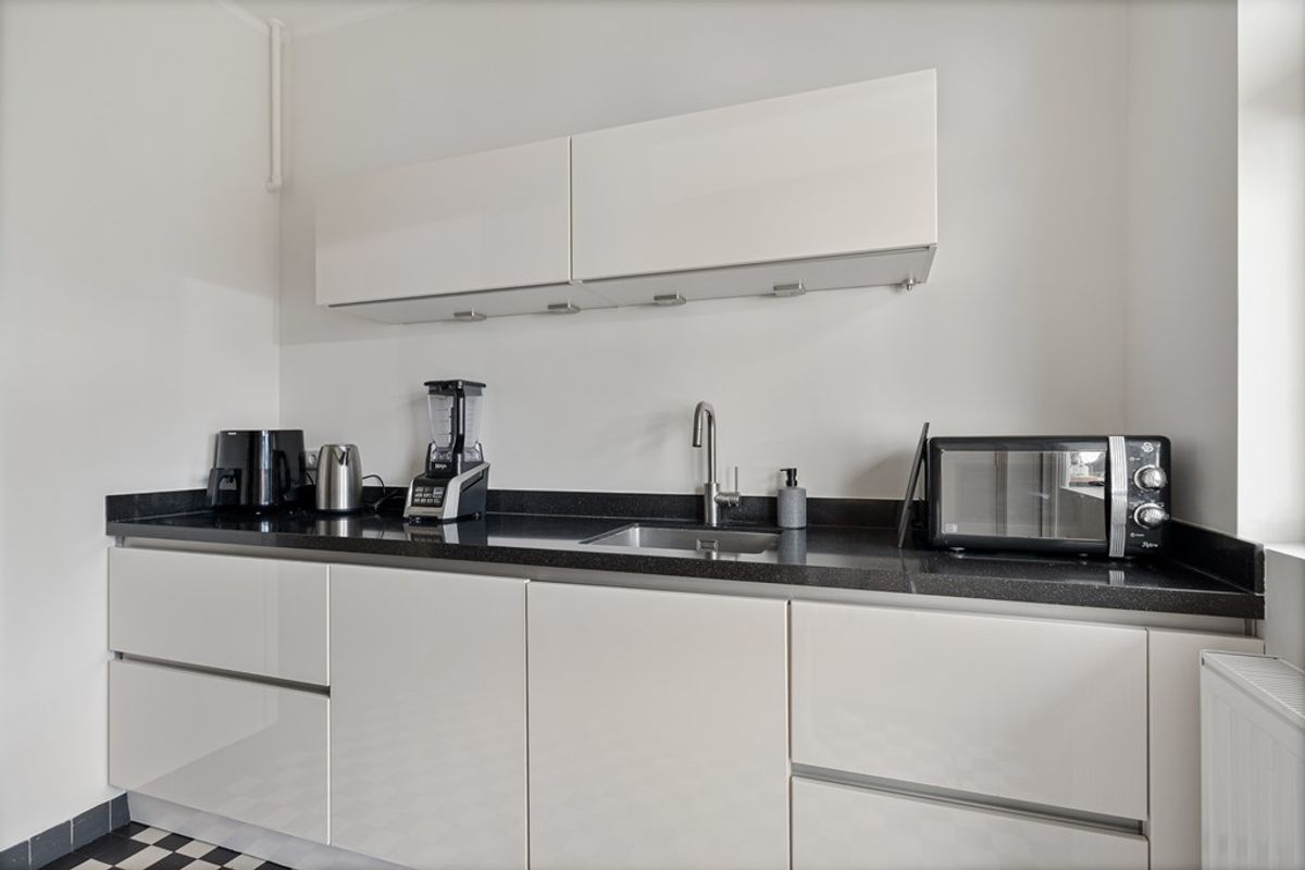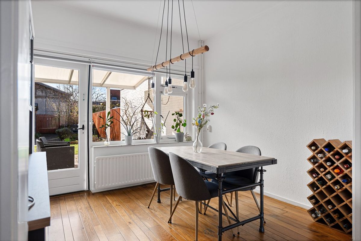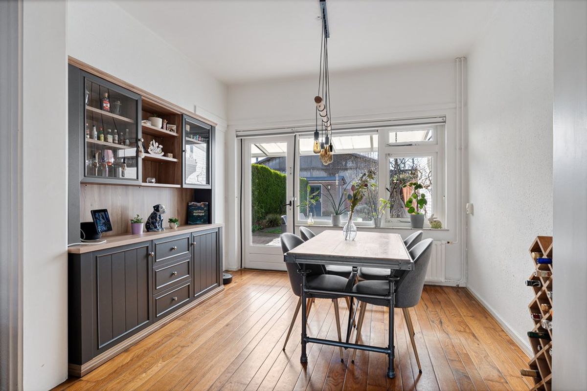 De woonkamer aan de voorzijde is licht en ruim dankzij de grote raampartijen en biedt voldoende ruimte voor een comfortabele zithoek. Aan de achterzijde bevindt zich de eetkamer, die in directe verbinding staat met de keuken.