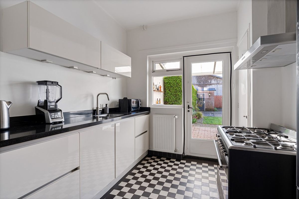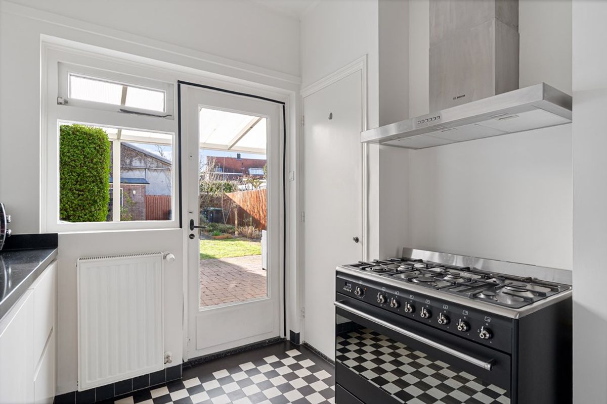 De keuken is praktisch ingericht en voorzien van een gasfornuis, afzuigkap en spoelbak. Vanuit de keuken en eetkamer heeft u toegang tot de overkapping en de tuin.