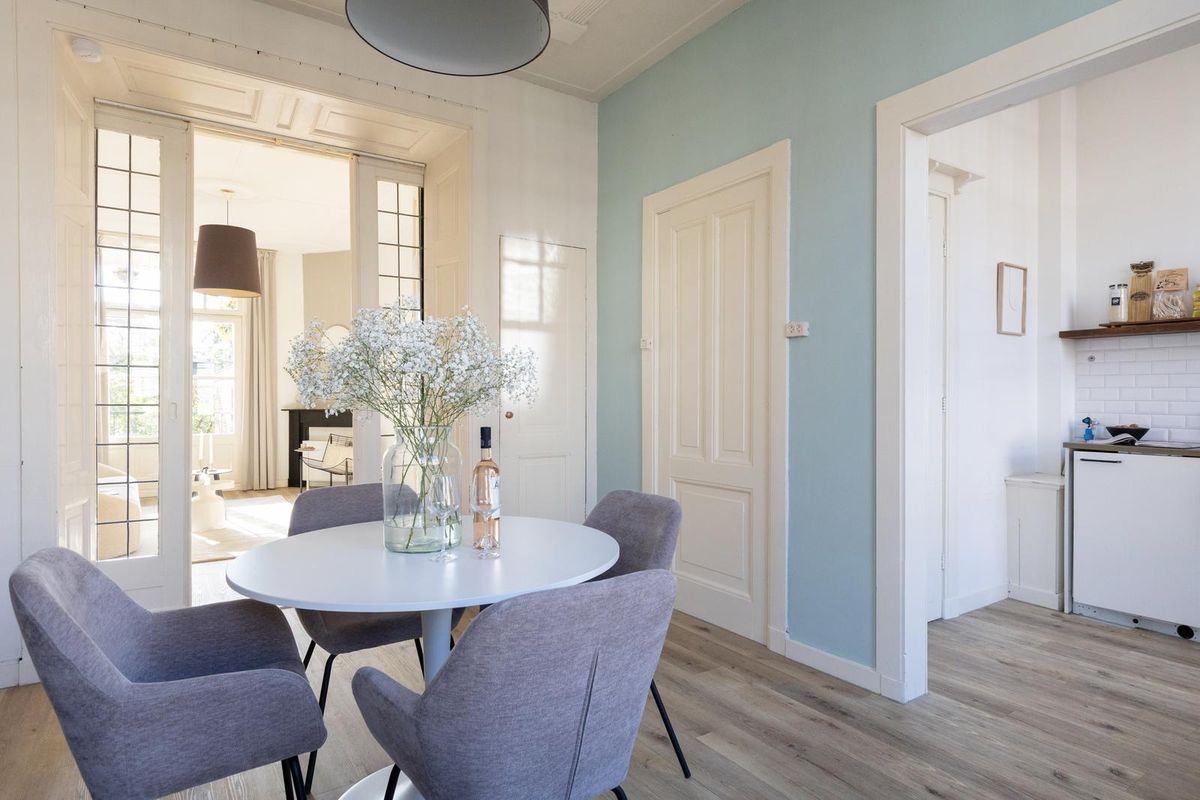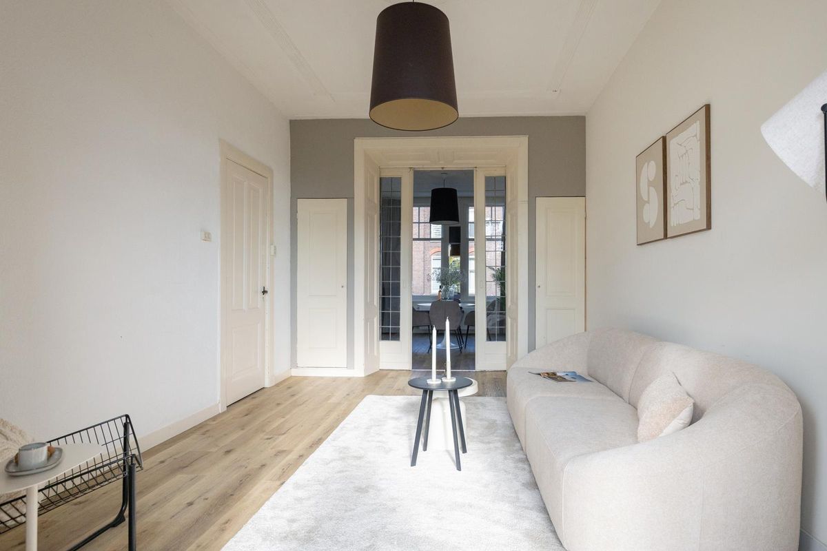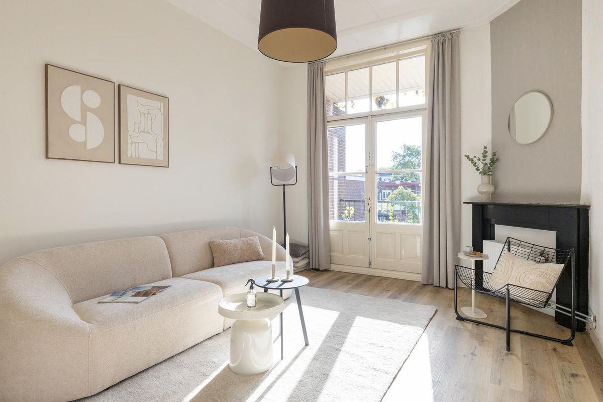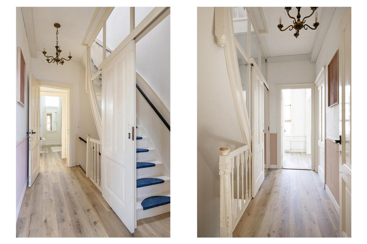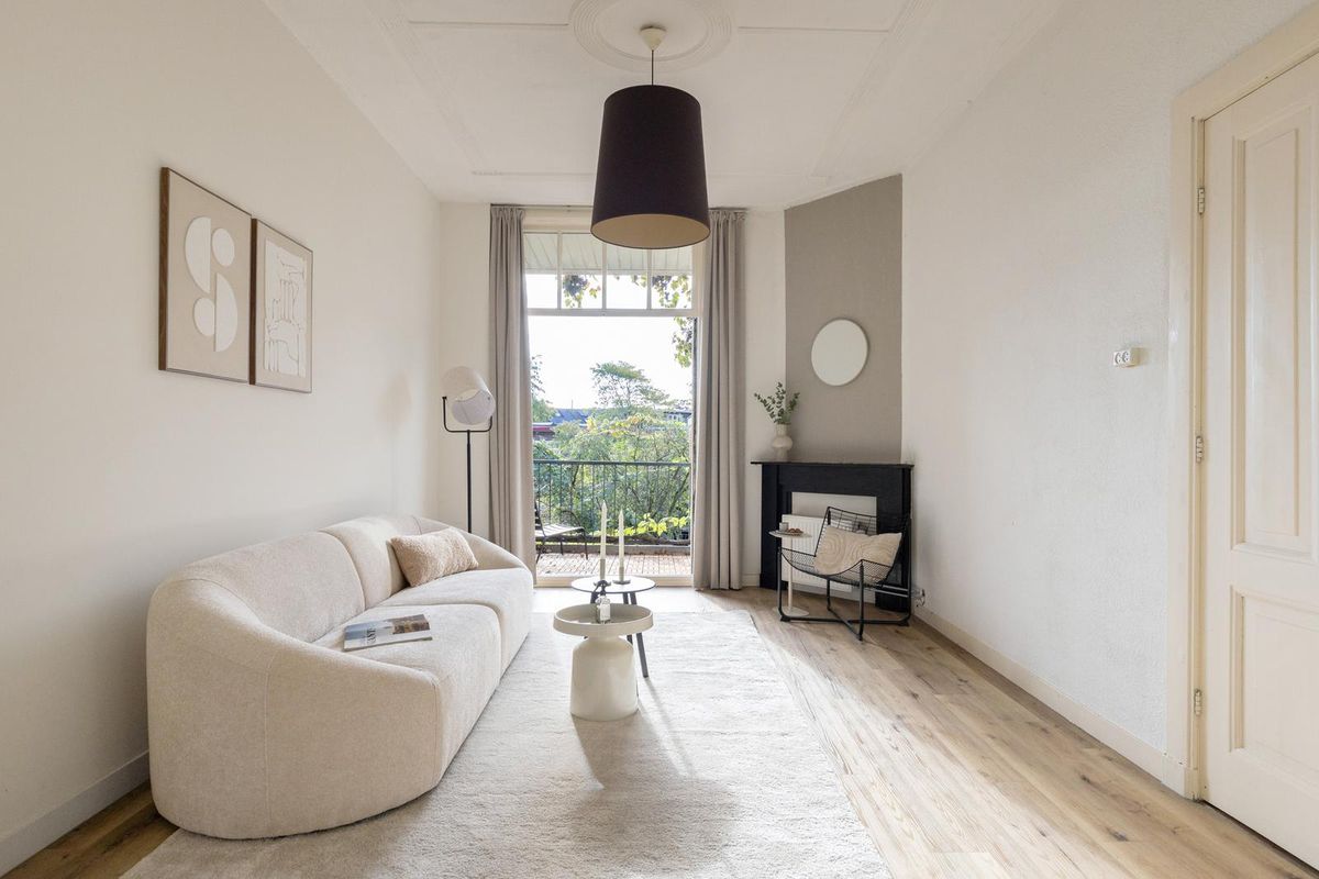Via je eigen entree kom je op de eerste verdieping. De royale woonkamer is een echte eyecatcher, met sfeervolle ensuite-deuren en handige inbouwkasten. Zowel in de eetkamer als in de woonkamer vind je originele schouwen. Vanuit de woonkamer loop je via dubbele deuren door naar het ruime balkon op het zuidoosten. Een ideale plek om te genieten van de ochtend/middagzon. Ook de badkamer geeft toegang tot dit balkon.
