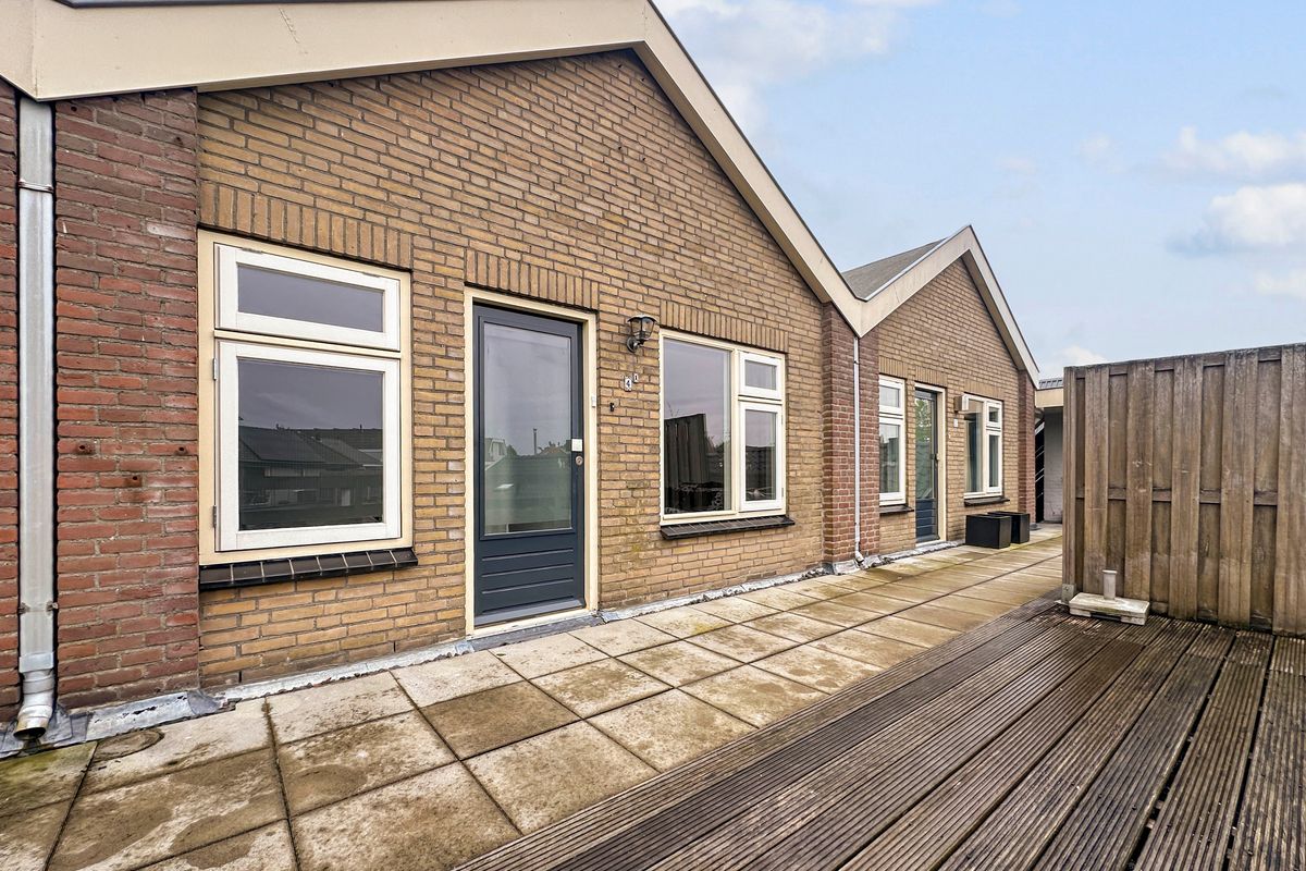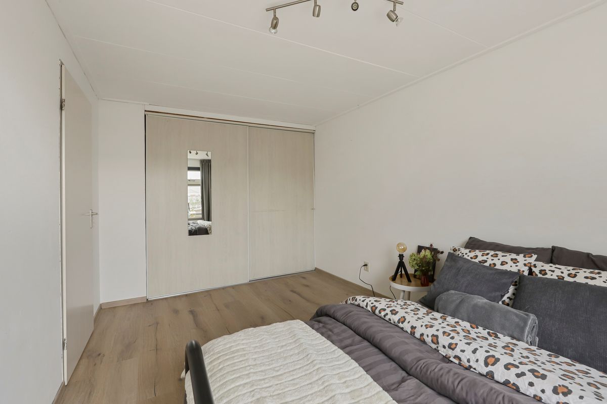 Aan de galerijzijde ligt de slaapkamer, een rustige plek om te ontspannen. De vaste schuifdeurkasten zorgen voor een nette, opgeruimde uitstraling en bieden volop bergruimte voor kleding en linnengoed.