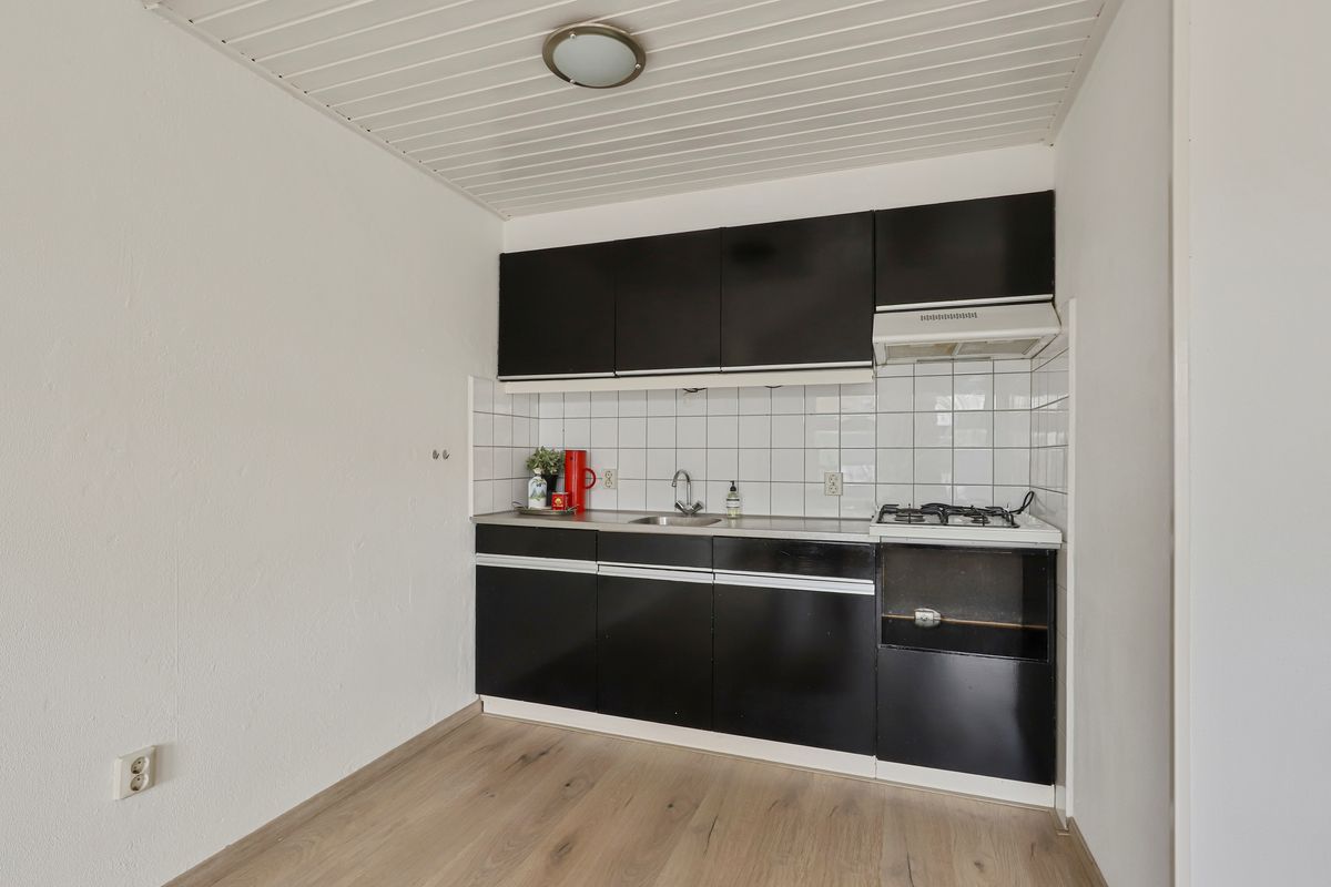 Wanneer je de deur opent, valt meteen het vele daglicht op. De woonkamer is ruim en de ramen strekken zich uit over de hele breedte – ideaal voor wie houdt van een lichte, open sfeer. Het eenvoudige keukenblok nodigt uit om je eigen draai te geven: vandaag kook je misschien simpel, maar morgen kun je hier jouw droomkeuken realiseren.