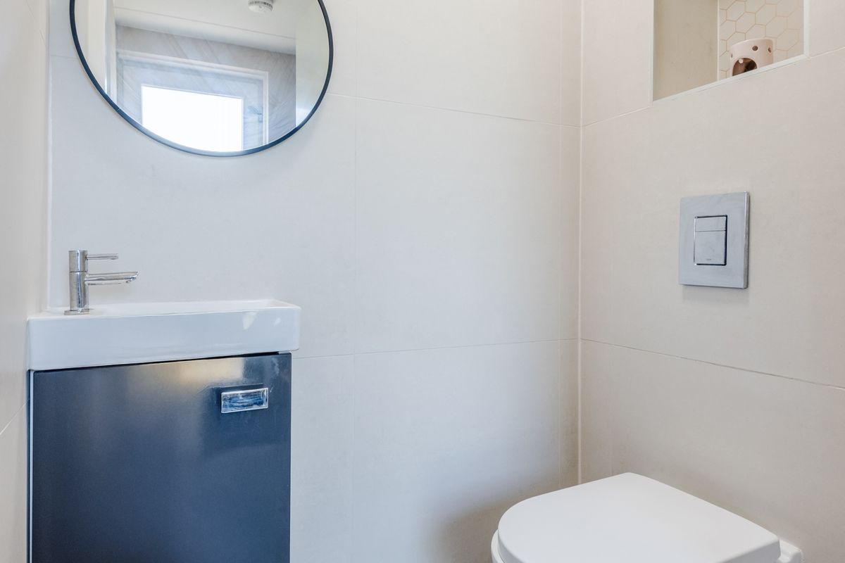 De badkamer is volledig betegeld en uitgerust met een inloopdouche, wastafelmeubel en hangend toilet. De verdieping is afgewerkt met een nette laminaatvloer.