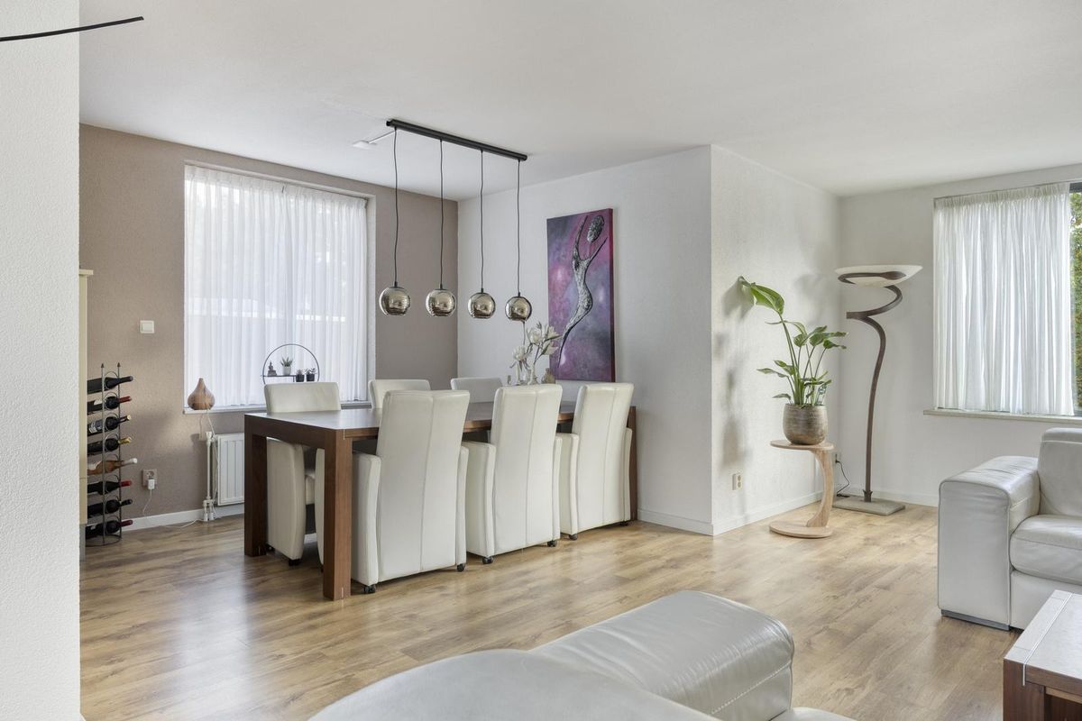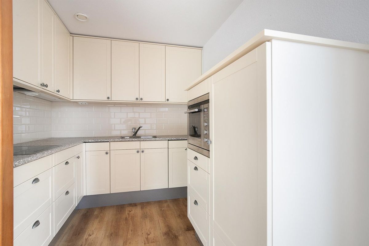 De keuken is opgesteld in een hoek en voorzien van een apart apparatenblok met koelkast en combimagnetron. In het andere deel vind je de vaatwasser, spoelbak met moderne kraan, inductiekookplaat en afzuigkap. Er is voldoende werk- en opbergruimte, zodat koken hier zowel praktisch als plezierig is. In het verlengde van de keuken is meer dan genoeg ruimte om een royale eettafel met 6 stoelen neer te zetten.