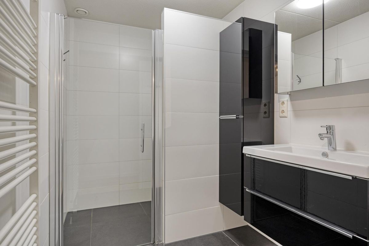 Het toilet is keurig betegeld en voorzien van een staand closet en fonteintje. De badkamer is eveneens netjes afgewerkt en uitgerust met een royale inloopdouche, een modern badkamermeubel met spiegelkast, een losse kast en een designradiator. Alle ruimte om je spullen op te bergen en comfortabel te gebruiken.