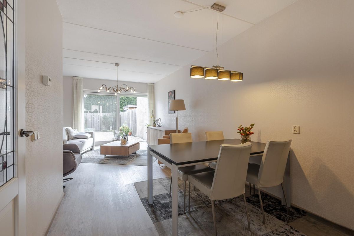 De woning beschikt over een royale en lichte woonkamer met schuifpui naar de zonnige achtertuin (gelegen op het zuiden!). Hier kun je in alle privacy genieten van het groen om je heen. Geen inkijk en geen drukte maar rust en ruimte. Aan de voorzijde vind je een sfeervolle keuken met erker, waar het ochtendlicht prachtig binnenvalt.