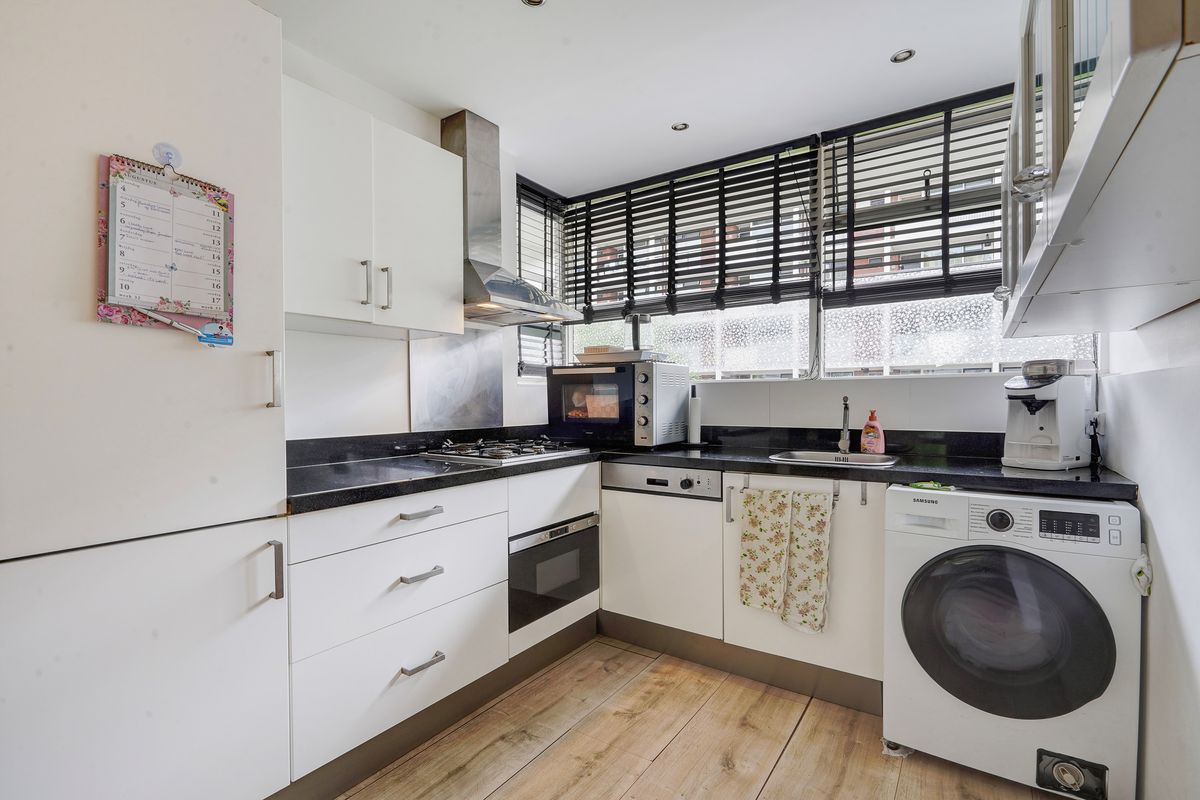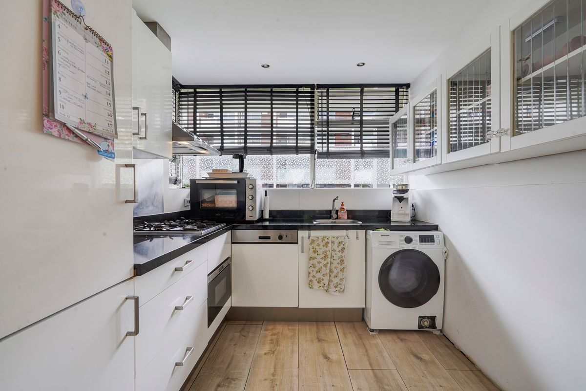 Het hart van de woning wordt gevormd door de lichte L-vormige woon- en eetkamer. Aan de voorzijde treft u de ruime eetkeuken met grote raampartijen, waardoor er een prettige en lichte sfeer ontstaat. De keuken is uitgerust met een 4-pits kookplaat, afzuigkap, koelkast, magnetron en vaatwasser. Vanuit de woonkamer heeft u toegang tot het ruime balkon, waar u heerlijk kunt genieten van de zon en het uitzicht.