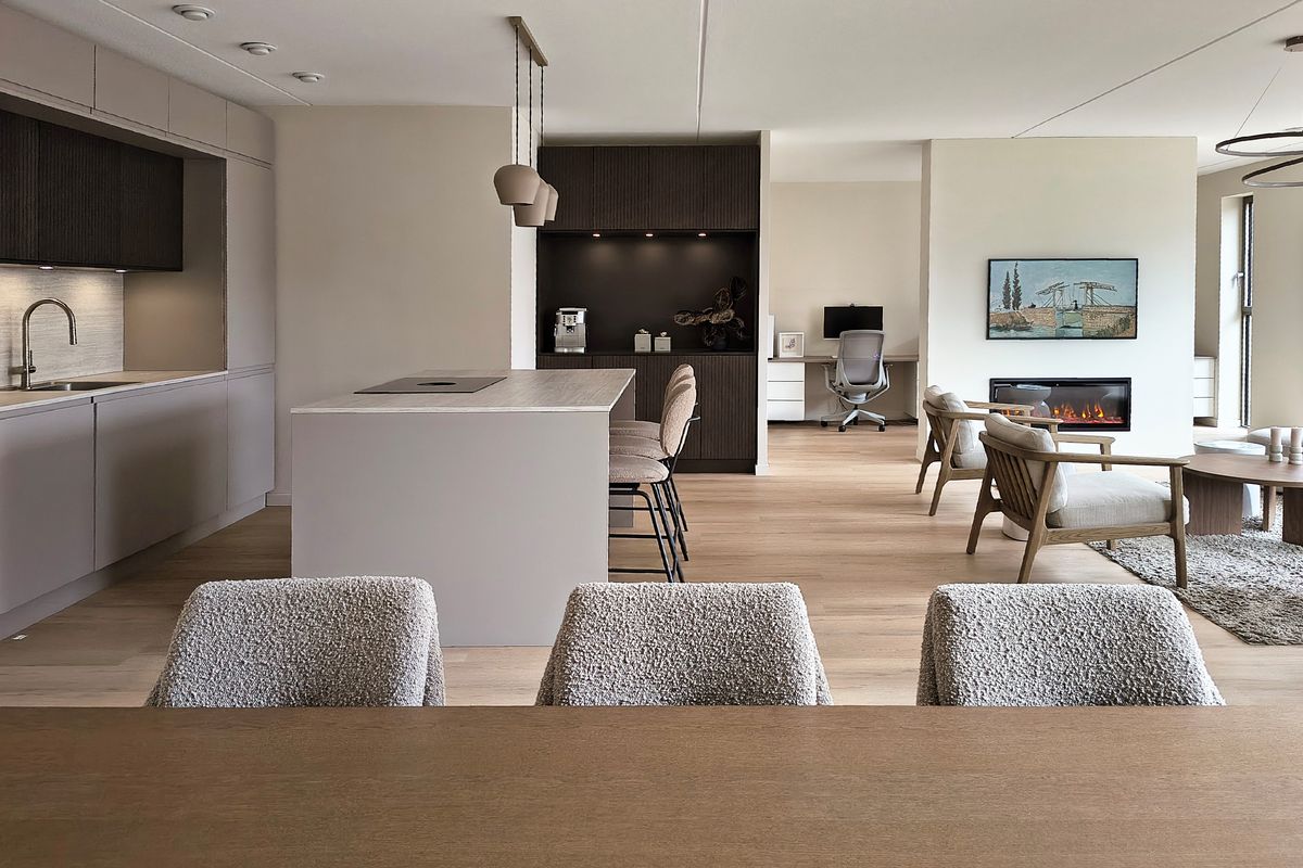 De woonkamer ligt aan de zonnige voorzijde op het zuiden, waardoor de ruimte de hele dag door van natuurlijk licht wordt voorzien. De woonkamer is elegant ingericht met een comfortabele zithoek en high-end meubels. Daarnaast is er een apart gedeelte ingericht als kantoor, perfect voor wie veel thuiswerkt of studeert.