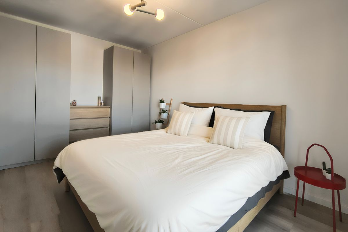 Via de hal heb je toegang tot alle ruimtes van het appartement. Aan de voorzijde, op het noorden, bevinden zich twee royale slaapkamers, beide volledig gemeubileerd met hoogwaardige, moderne meubels. Alles is nieuw en zorgvuldig uitgekozen voor comfort en stijl.