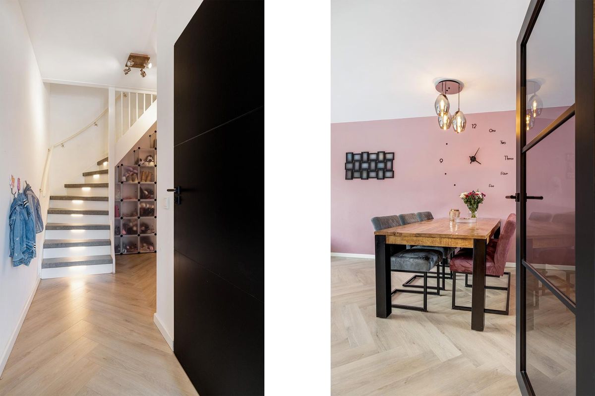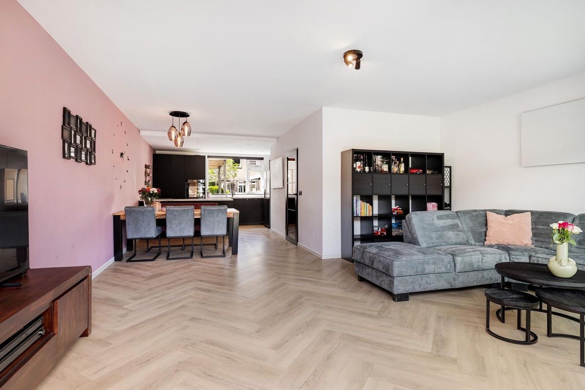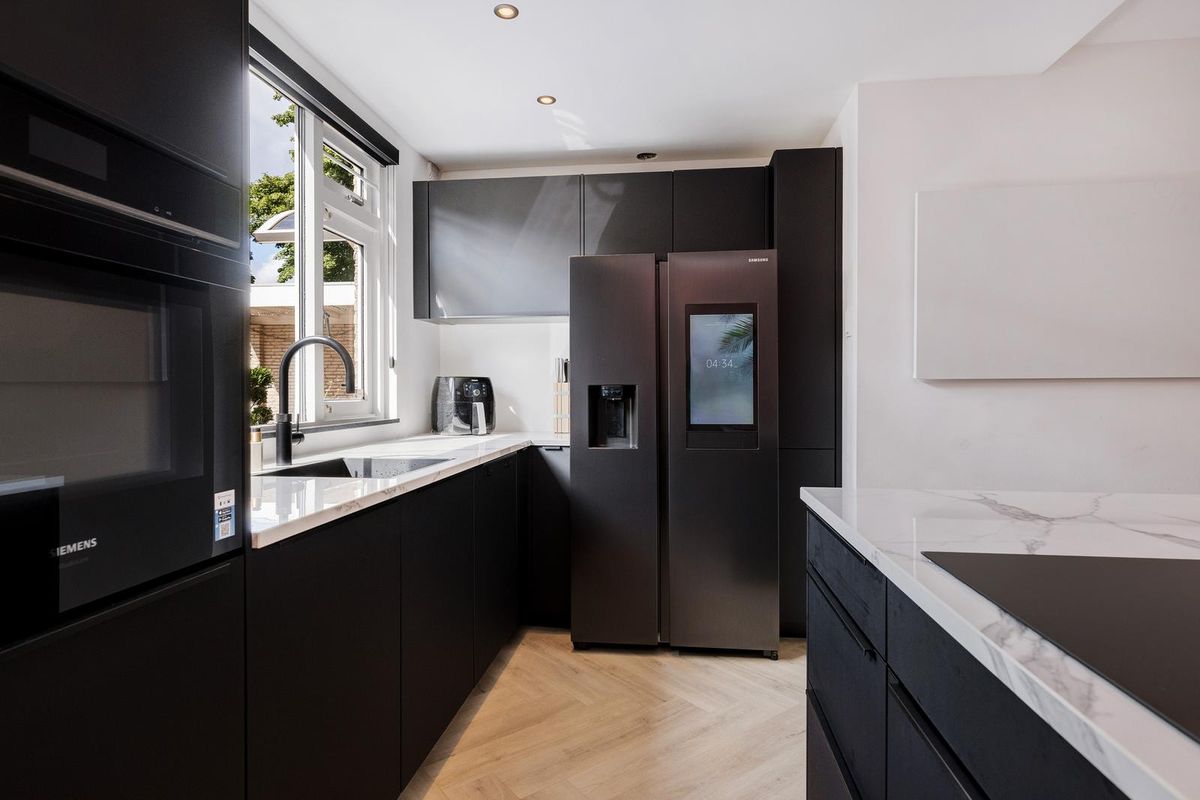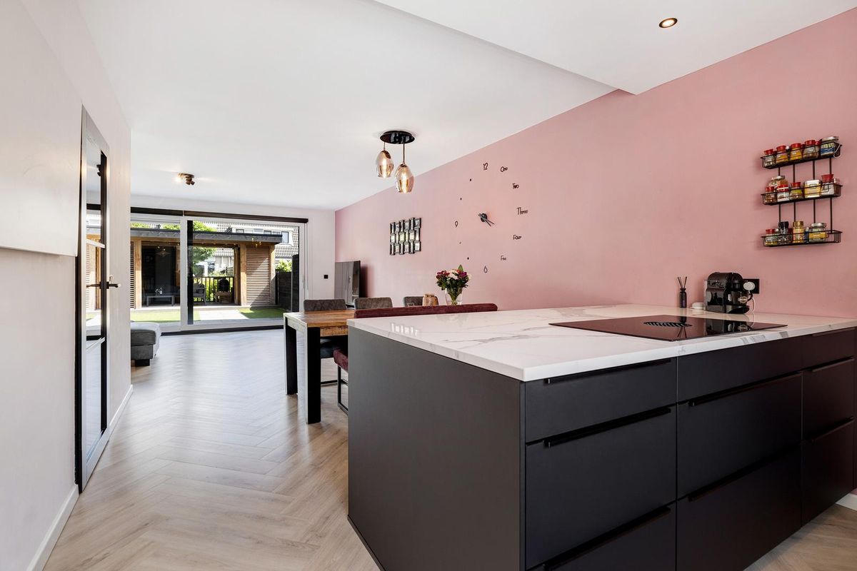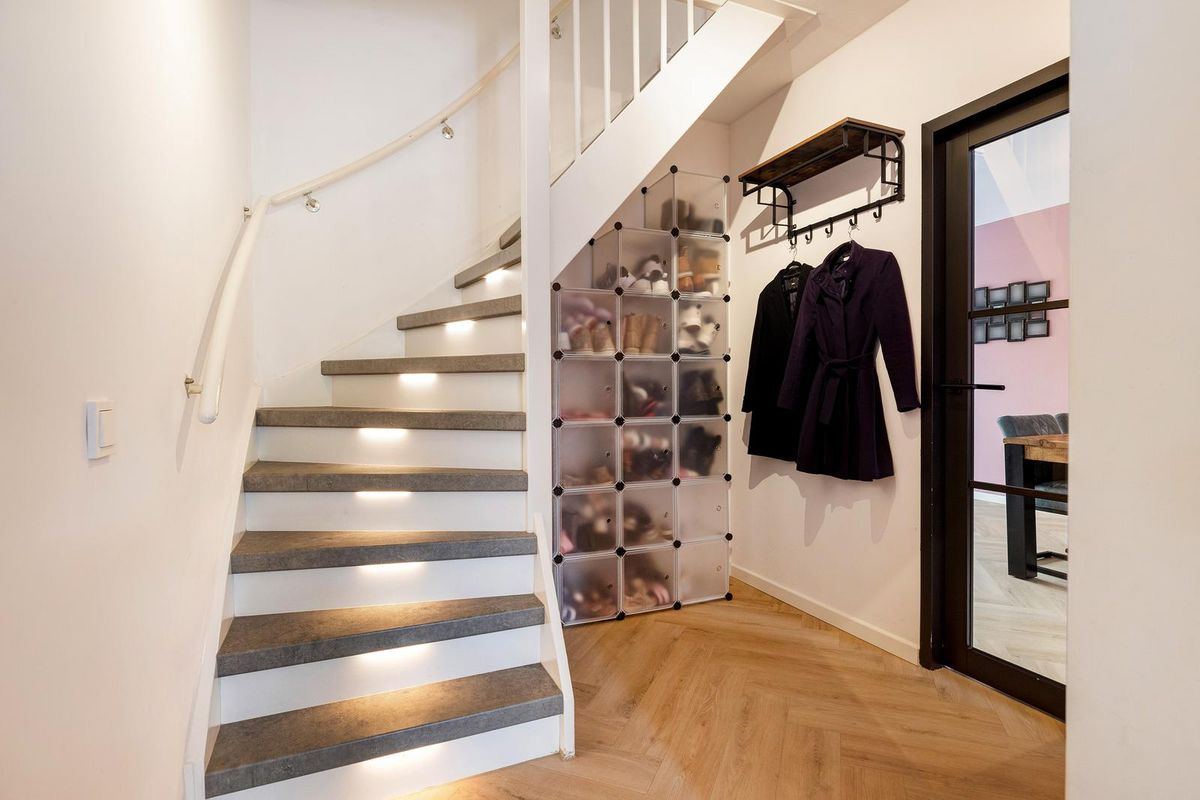 Ruime entree/tochtportaal met meterkast. Vanuit hier toegang tot de hal met toiletruimte v.v. hangend closet en fonteintje, en trapopgang naar de 1e verdieping. Vanuit de hal bereik je de living met aan de achterzijde gesitueerde woonkamer met veel licht door de schuifpui (2023) (v.v. schuifhor). Tevens elektrisch zonnescherm (2023) aanwezig. Aan de voorzijde gesitueerde keuken (2023) welke bestaat uit een wandopstelling en kookschiereiland met beiden een gecoat keramiek blad. De wandopstelling heeft veel opbergruimte en is v.v. een spoelbak met kokendwaterkraan (Qooker), 'smart' stoomoven (Siemens 'studio line'), vaatwasmachine (Bosch, 2021), carrouselkast en wasmachine- en drogeraansluiting. Tevens staat er een losse koelkast (Samsung, ter overname). Het kookeiland met ontbijtbar heeft diverse opberglades en is v.v. een inductiekookplaat met 4 zones met geïntegreerde kookplaatafzuiging (Bora). De keuken is v.v. een verlaagd plafond met inbouwspots. De begane grond (m.u.v. entree, toilet) is v.v. een pvc-visgraatvloer.