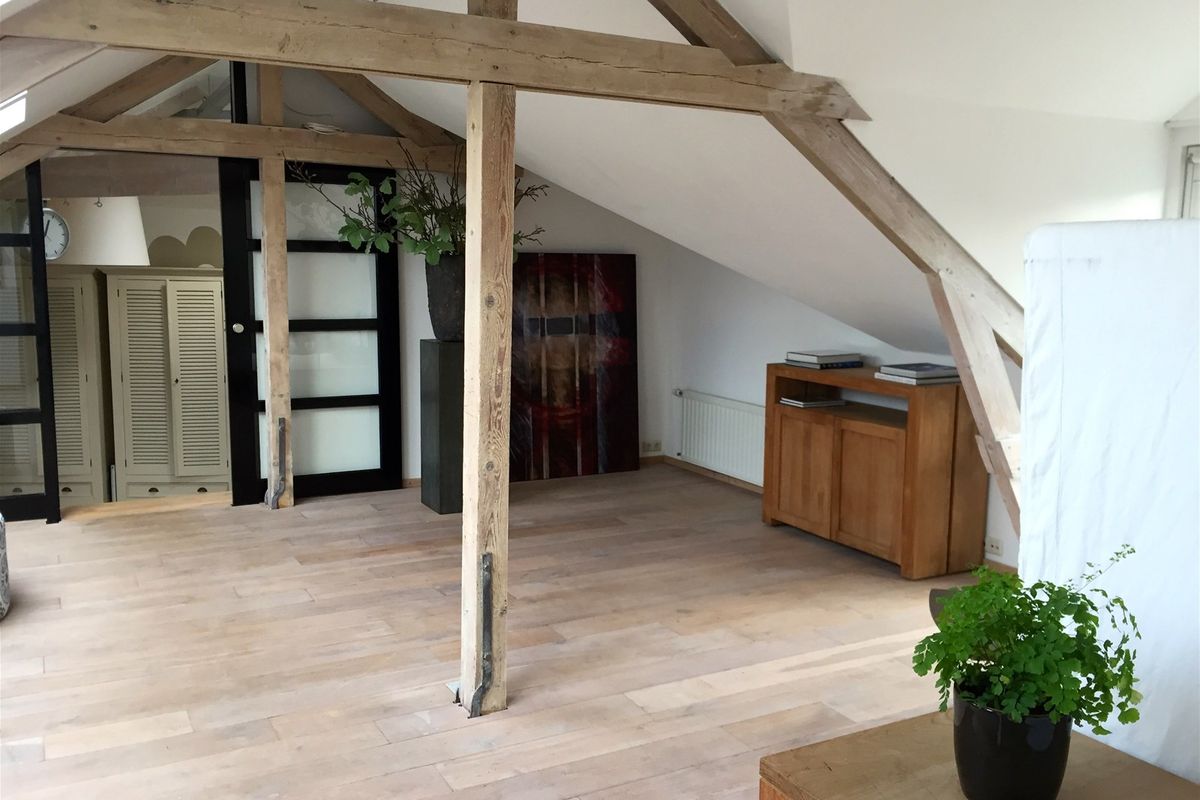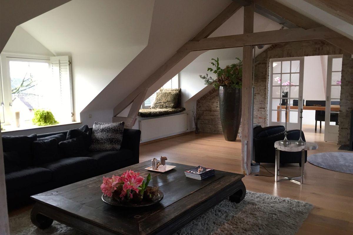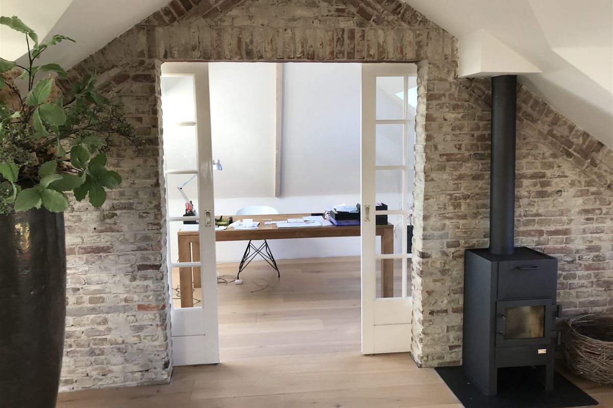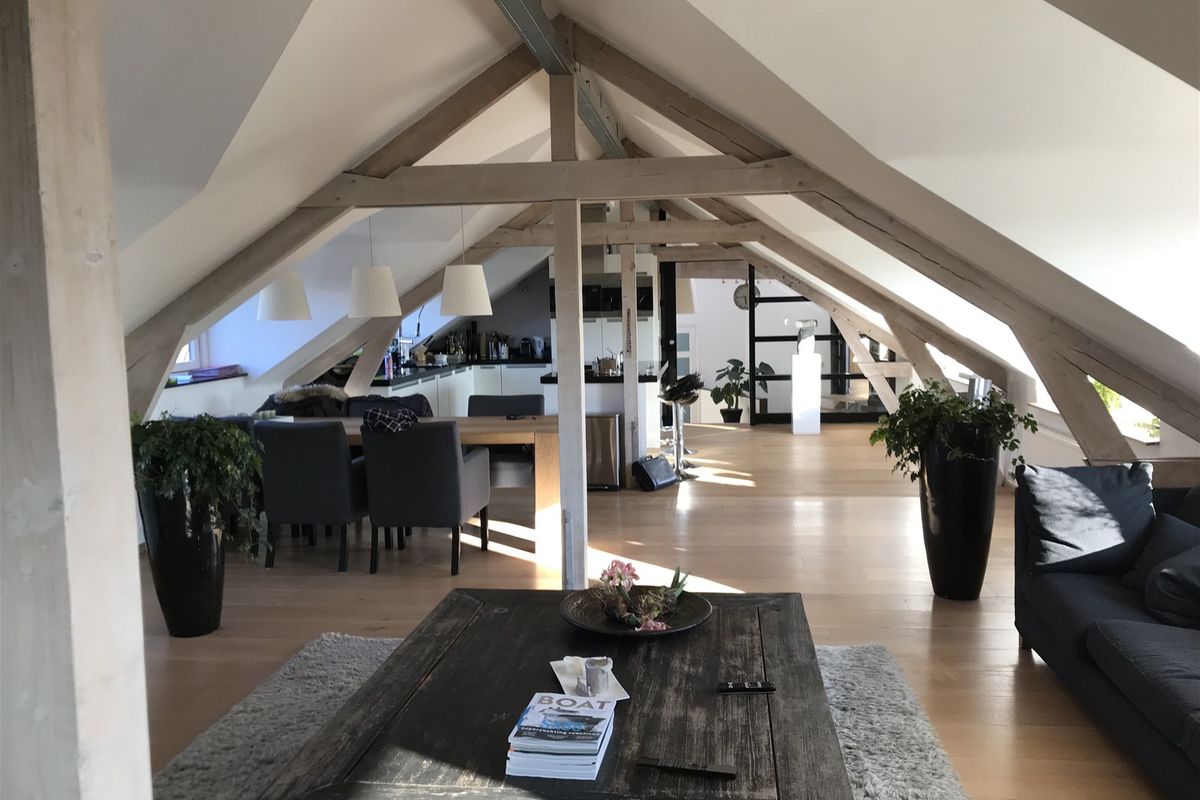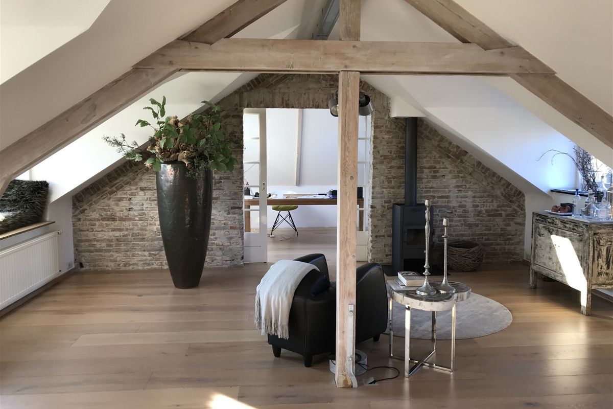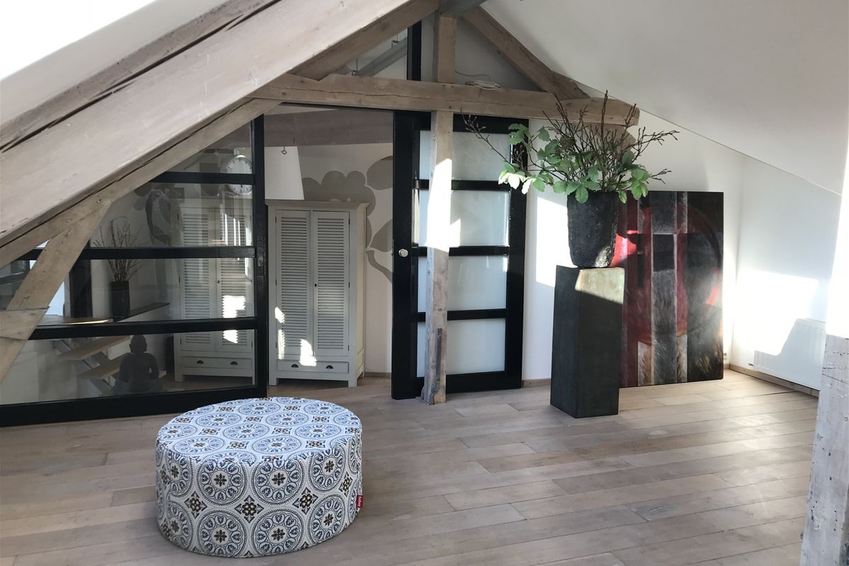 Ruimte genoeg voor een grote eethoek met aansluitend de royale living met de oude balkenconstructie nog in het zicht, deze kant van de loft heeft acht dakkapellen welke de ruimte veel licht en uitzicht geven. Een robuuste houtkachel maakt het geheel af.