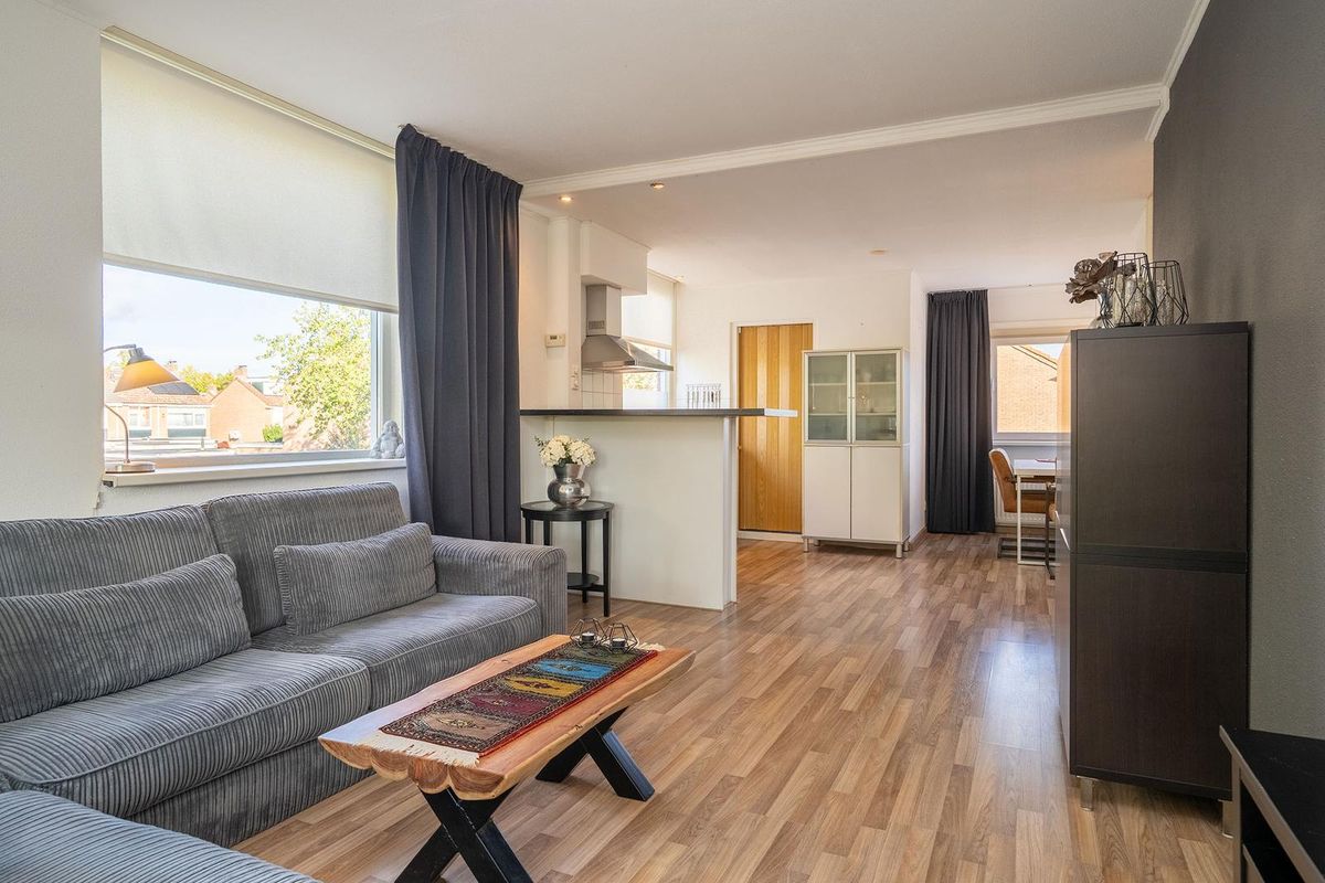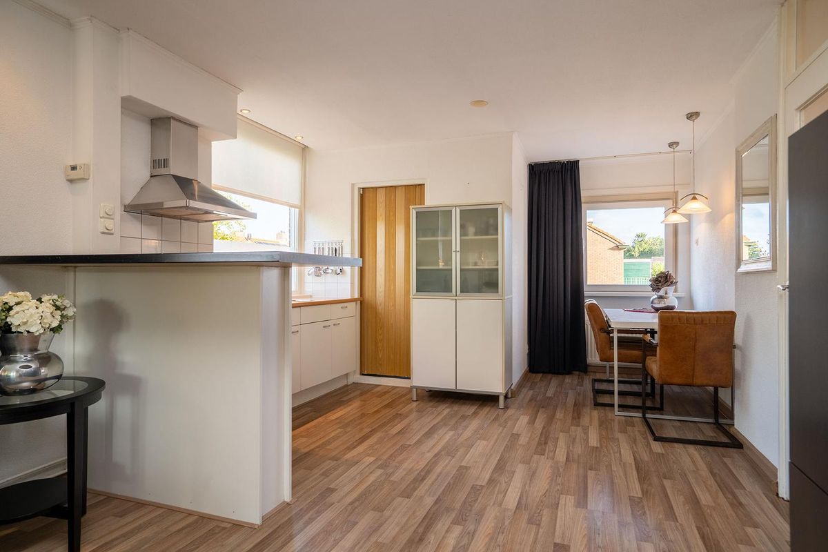 Centrale hal met trapopgang en toegang tot de bergingen. Entree, hal, bergkast, badkamer, toilet, slaapkamer, woonkamer met balkon, tweede slaapkamer en achtergelegen open keuken en bijkeuken en plek voor een grote eettafel.