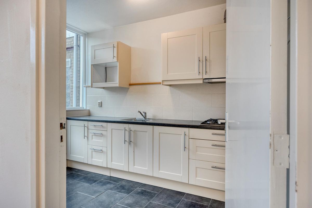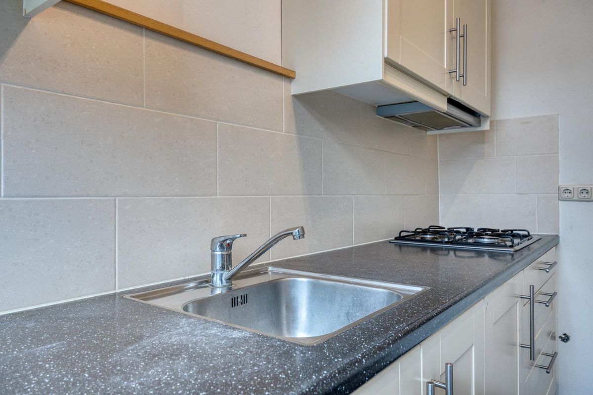 De keuken is gelegen aan de achterzijde van de woning en heeft een moderne, luxe inrichting in een rechte opstelling tegen de wand met voldoende onder- en bovenkastjes. Bovendien is de keuken voorzien van een 4 pits gaskookplaat met daarboven een afzuigkap, een koelkast en een spoelbak met mengkraan. Via een loopdeur komt u in de achtertuin.