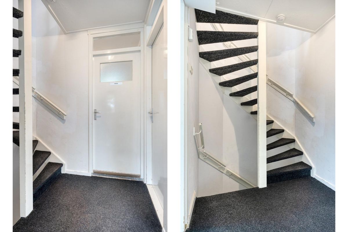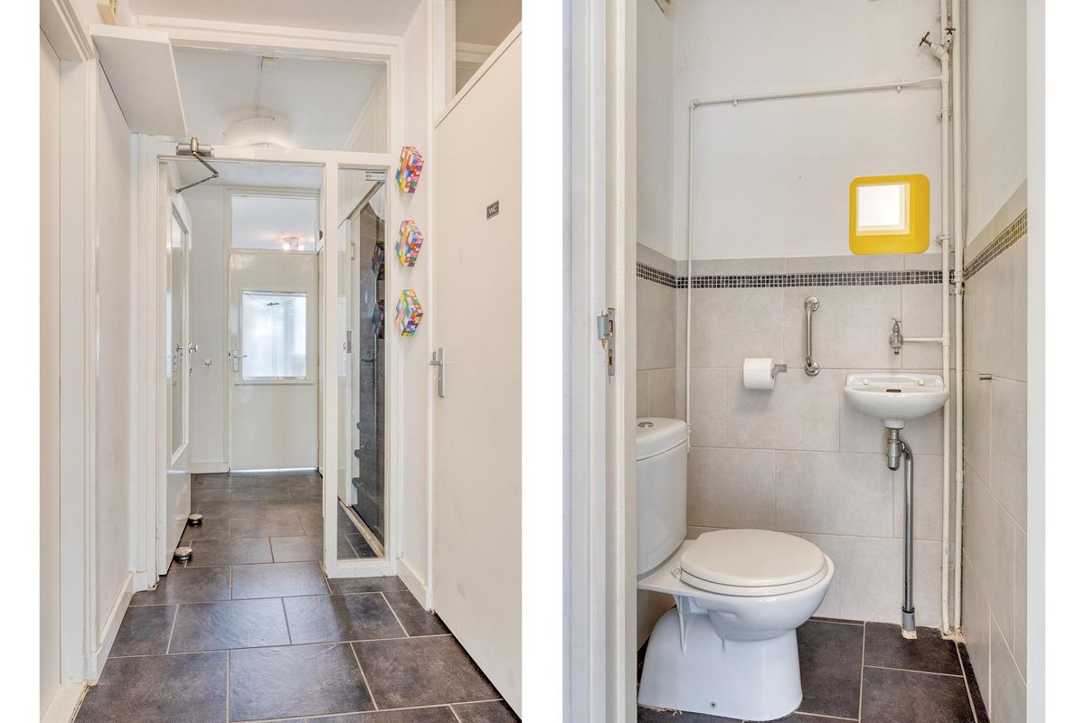 De hal is voorzien van een garderobe en de trapkast onder de trapopgang naar de eerste verdieping met de meterkast. Tenslotte bevindt zich in de hal de deels betegelde toiletruimte met een staand toilet en fonteintje. De hal staat via twee deuren met de kamer en er is toegang tot de keuken.