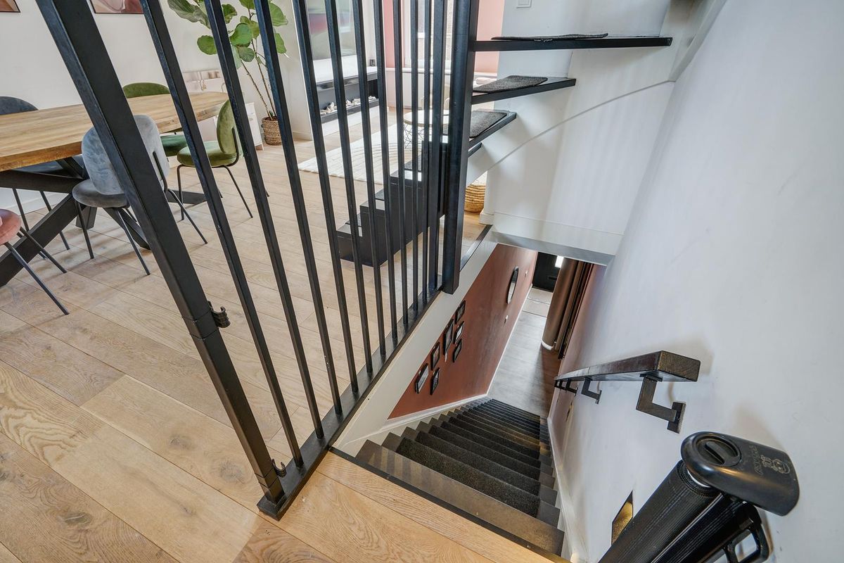 A stylish spiral staircase in the living room leads to the upper (sleeping) floor. Here you’ll find two more bedrooms and a second bathroom. The master bedroom is located at the front of the apartment. On the landing is a laundry area with space for a washing machine and dryer.