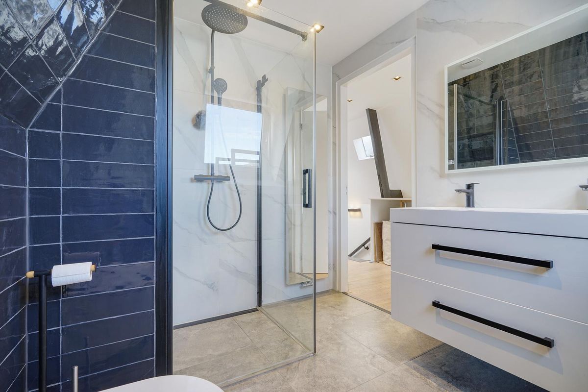 The second bathroom, located at the rear, features a walk-in shower, double washbasin, and a second toilet (Sanibroyeur). From the landing, there is access to the sunny roof terrace of approximately 10 m² — the perfect spot to enjoy the evening sun after a day at the beach, with plenty of room to relax with friends over drinks and snacks.