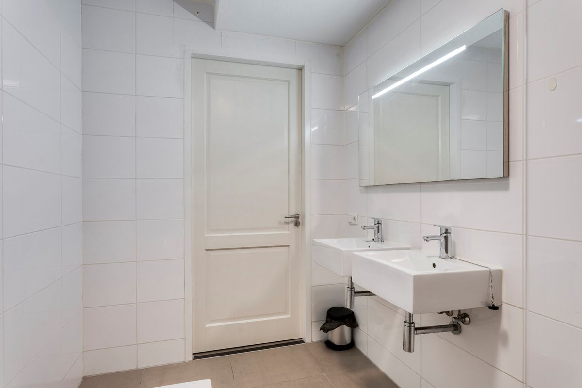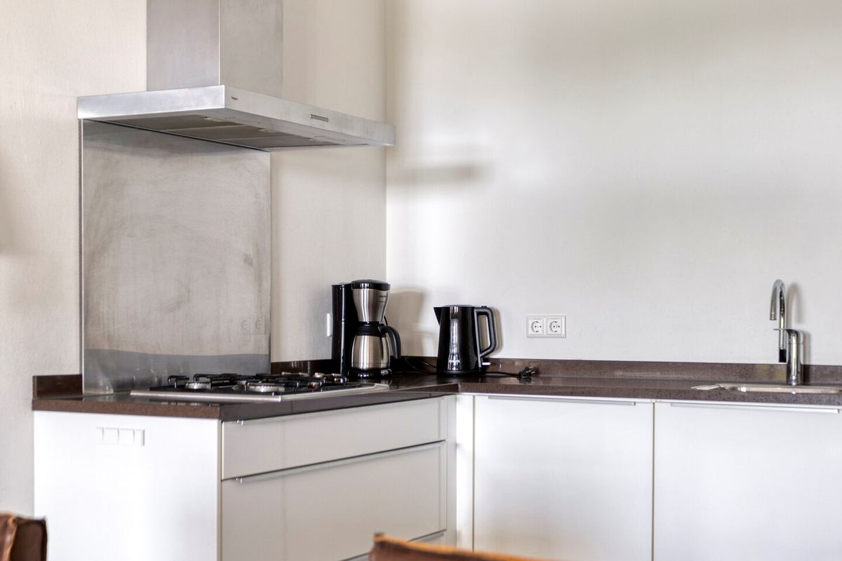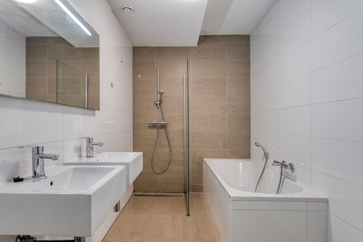 De keuken is uitgerust met een modern hoekmeubel en hoogwaardige inbouwapparatuur, waaronder een combi-oven, gaskookplaat, afzuigkap, vaatwasser en koelkast. Het donkere werkblad en de strakke witte kasten zorgen voor een eigentijdse uitstraling. Op de begane grond bevindt zich tevens de eerste slaapkamer, ideaal voor gasten of als werkkamer. Aangrenzend vind je een moderne badkamer met een inloopdouche en wastafelmeubel.