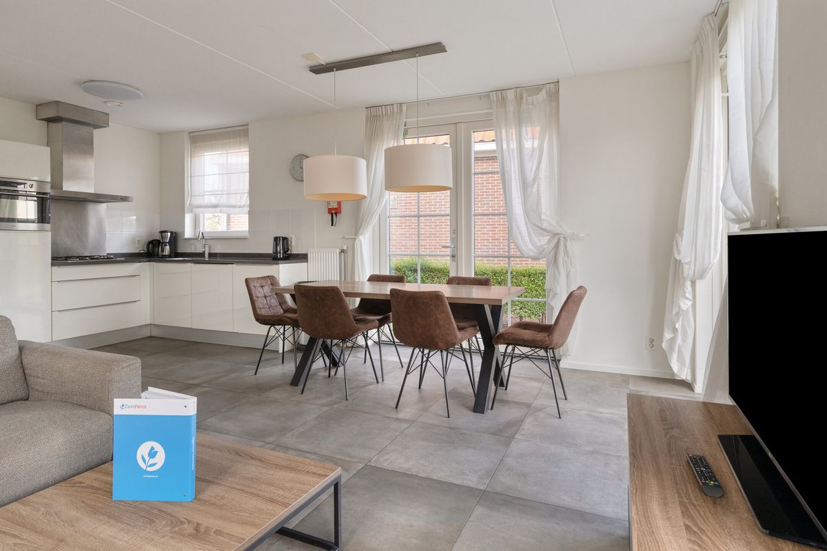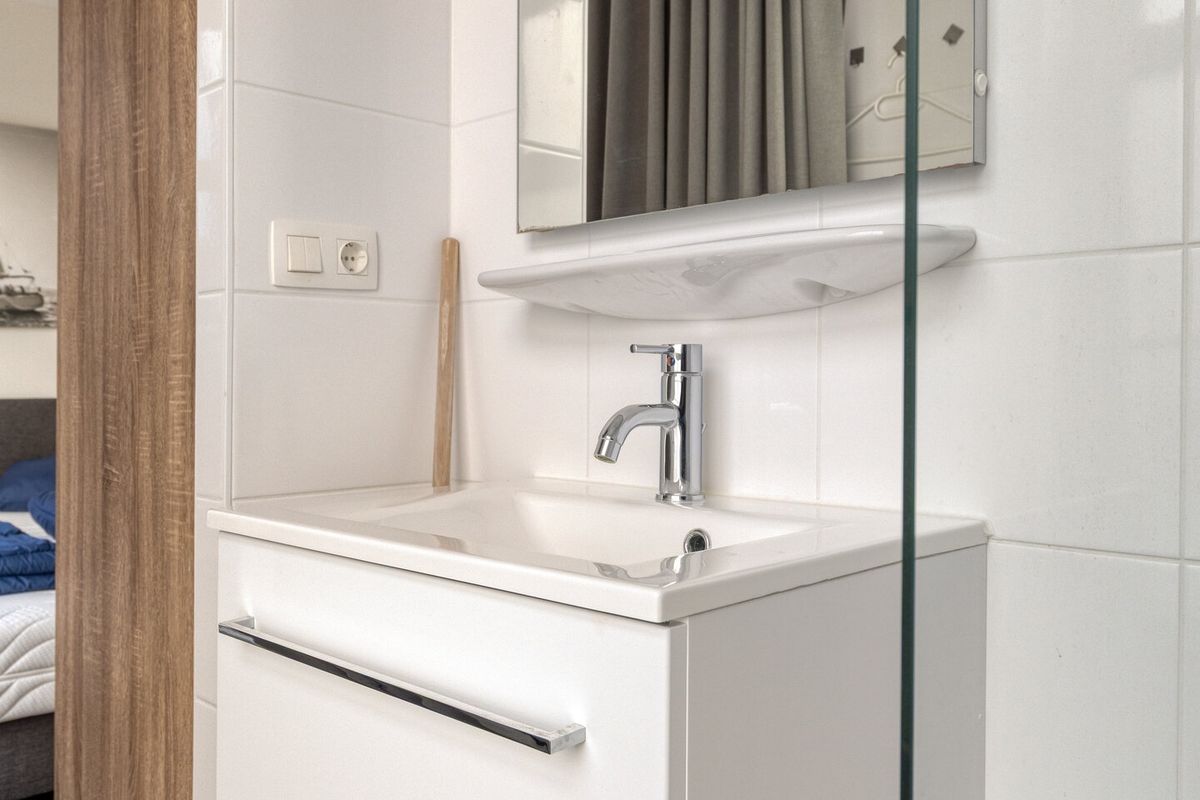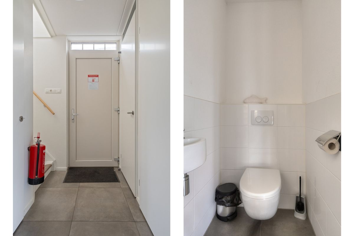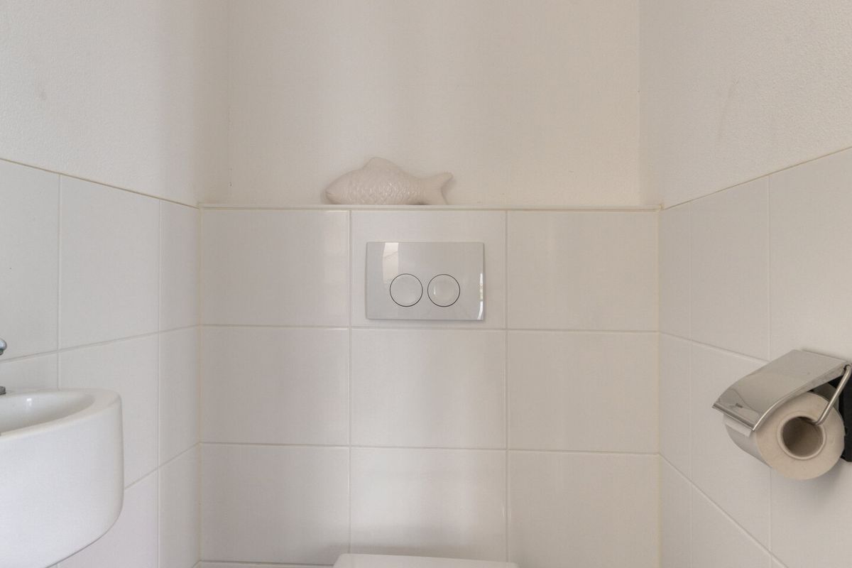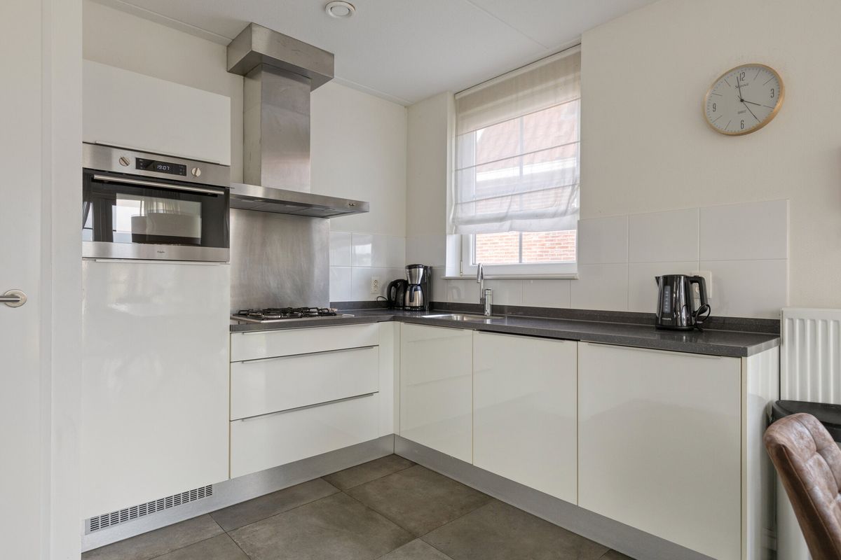 De keuken is uitgerust met een modern hoekmeubel en hoogwaardige inbouwapparatuur, waaronder een combi-oven, gaskookplaat, afzuigkap, vaatwasser en koelkast. Het donkere werkblad en de strakke witte kasten zorgen voor een eigentijdse uitstraling. Op de begane grond bevindt zich tevens de eerste slaapkamer, ideaal voor gasten of als werkkamer. Aangrenzend vind je een moderne badkamer met een inloopdouche en wastafelmeubel.