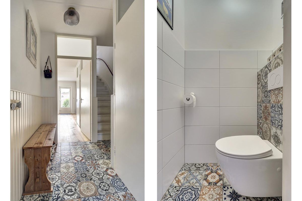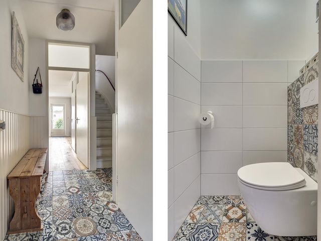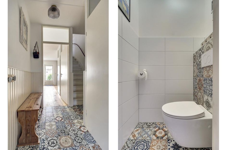 Bij binnenkomst valt meteen de karakteristieke tegelvloer op in de gang. De hal biedt toegang tot de meterkast, het toilet, de trapopgang naar boven en de woonkamer.