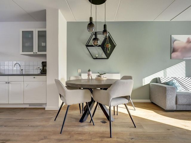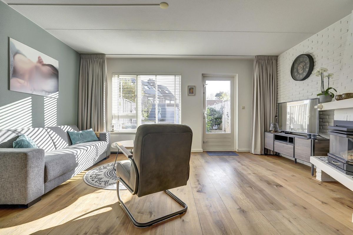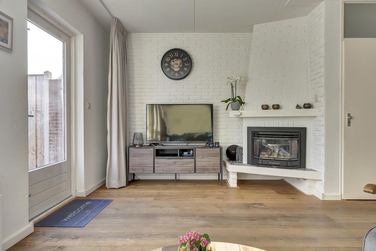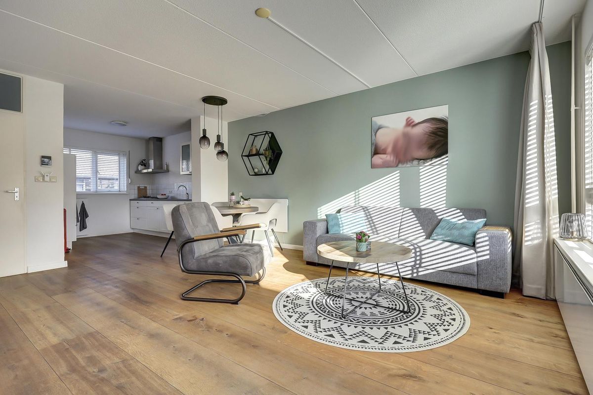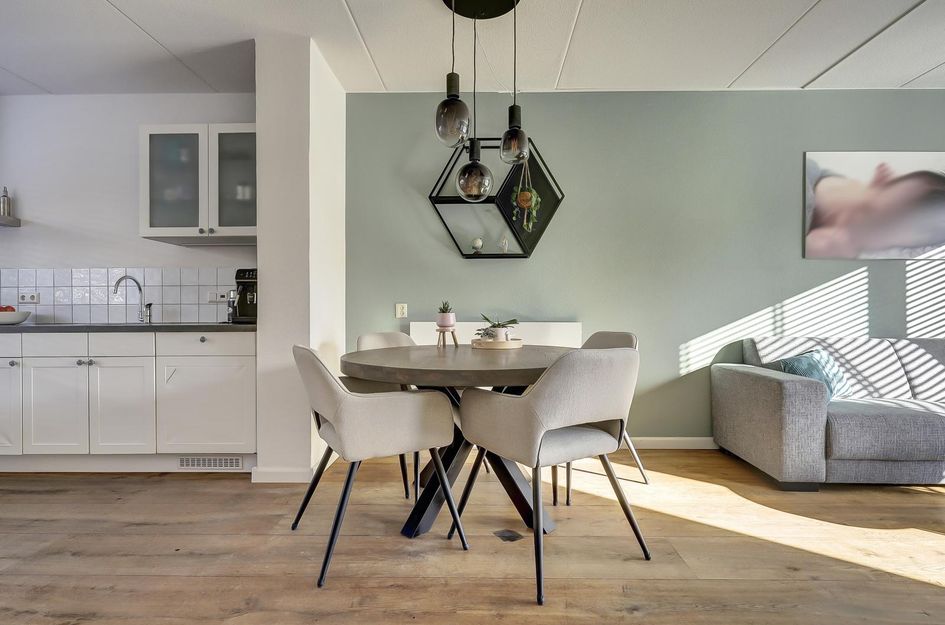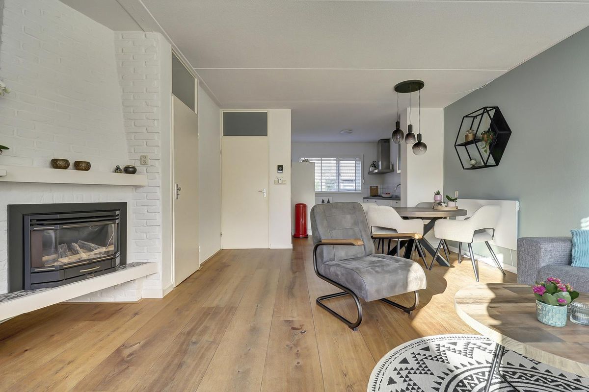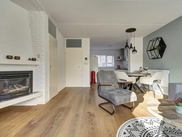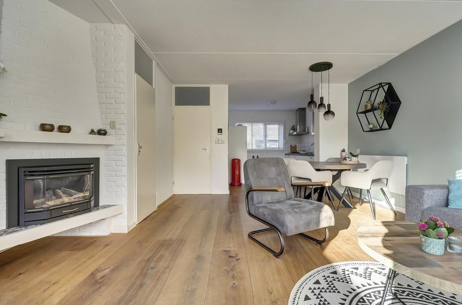 De woonkamer is ruim, warm en sfeervol ingericht met een prachtige houten vloer, lichte wanden en een eigentijdse accentkleur. De grote ramen aan de achterzijde zorgen voor veel daglicht, terwijl de zithoek bij de schouw een knusse plek vormt voor de koude dagen. Er is voldoende ruimte voor een comfortabele zithoek én een eettafel, waardoor de woonkamer het hart van de woning vormt.