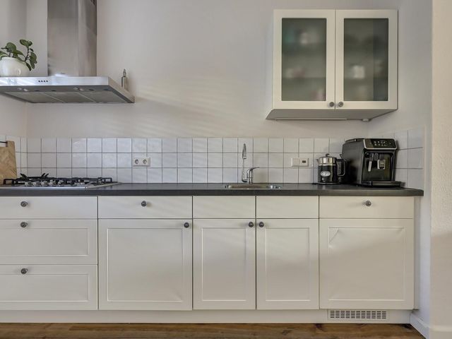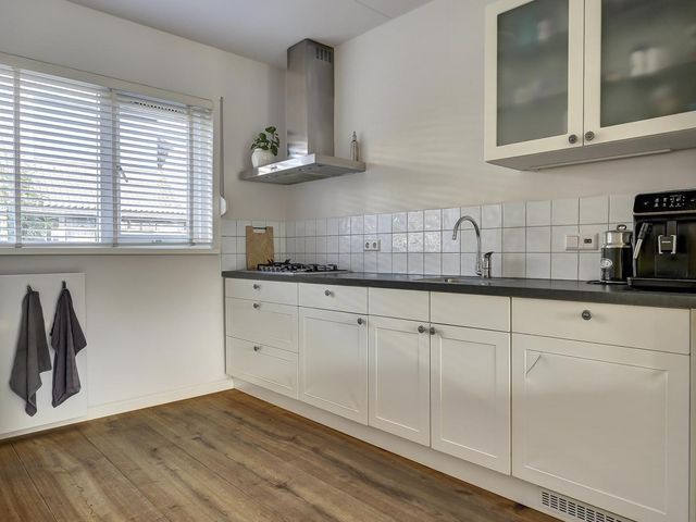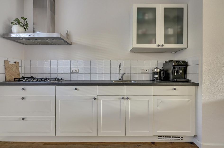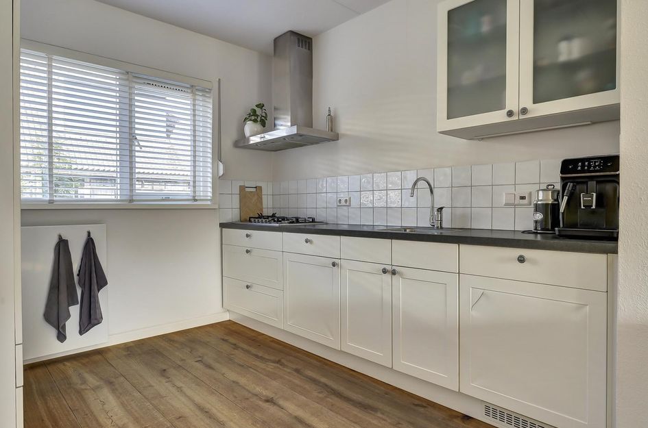 Aan de voorzijde bevindt zich de halfopen keuken, uitgevoerd in een neutrale stijl met witte kastfronten en een donker werkblad. De keuken is voorzien van diverse inbouwapparatuur, waaronder een gaskookplaat, afzuigkap, oven en koelkast. Dankzij de gunstige ligging aan de voorzijde geniet je hier van een prettig uitzicht tijdens het koken.
