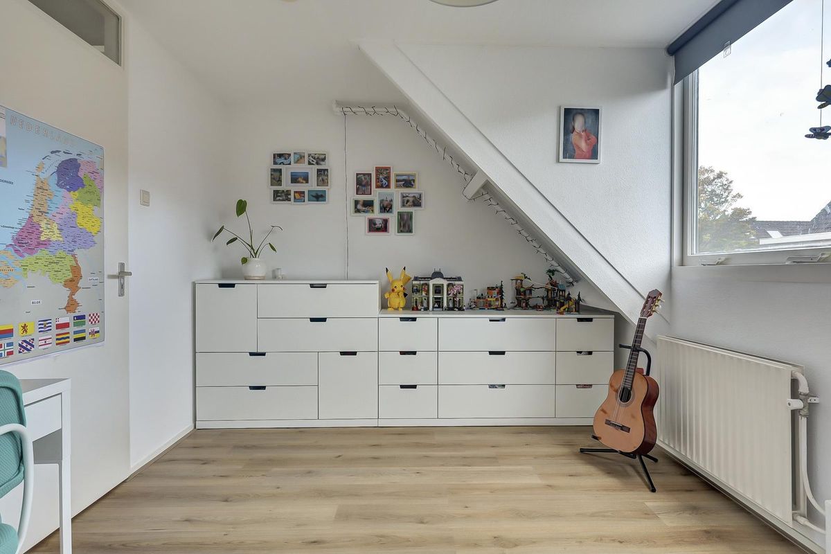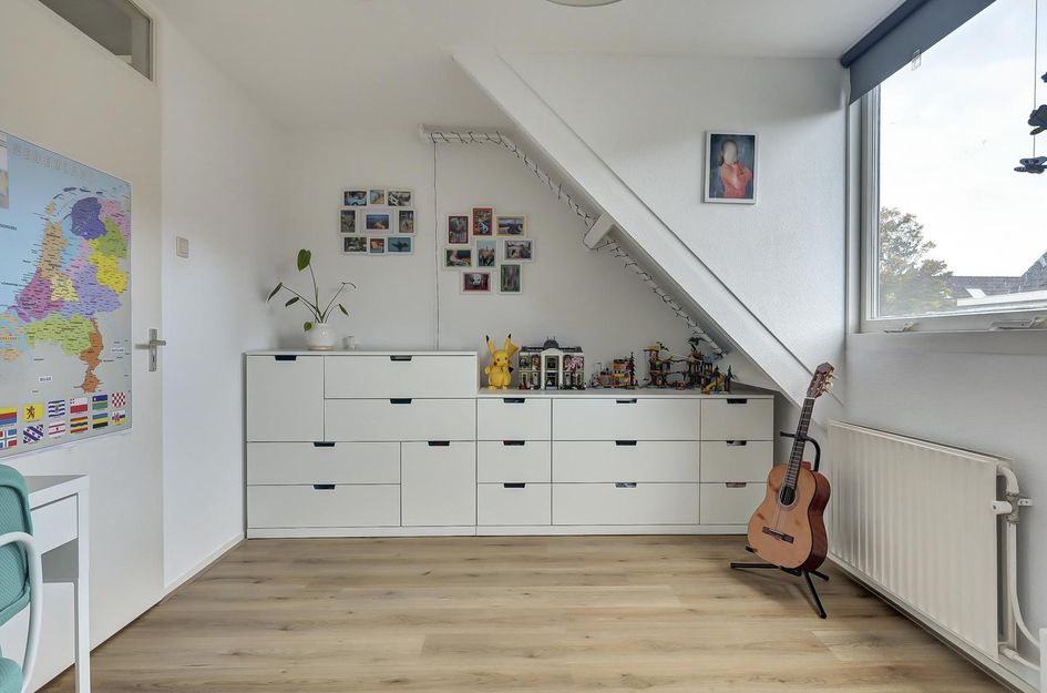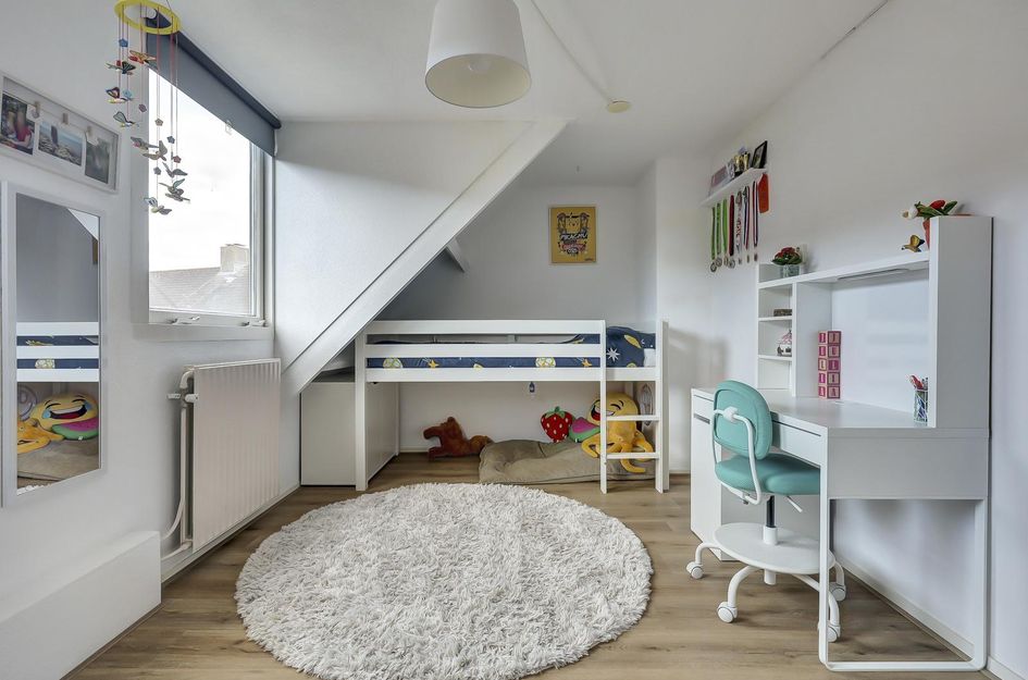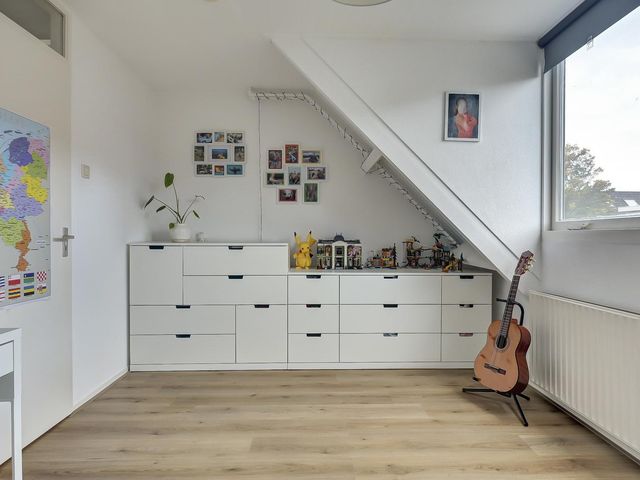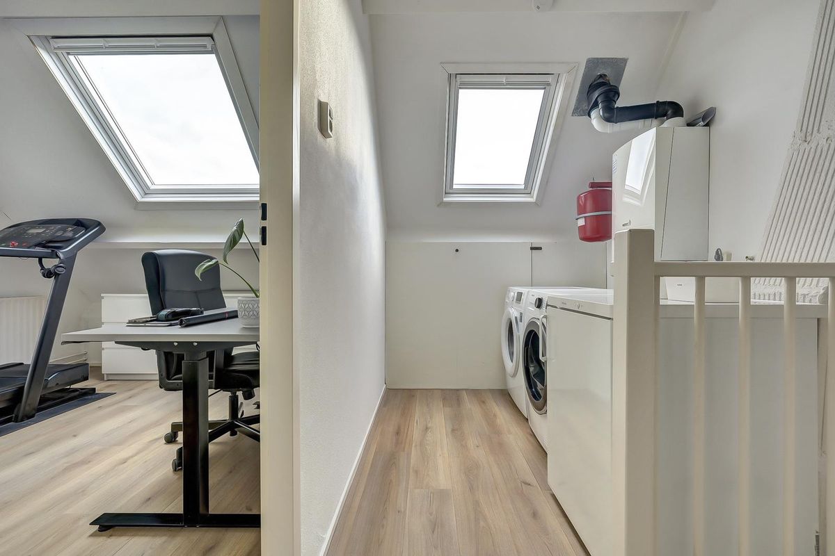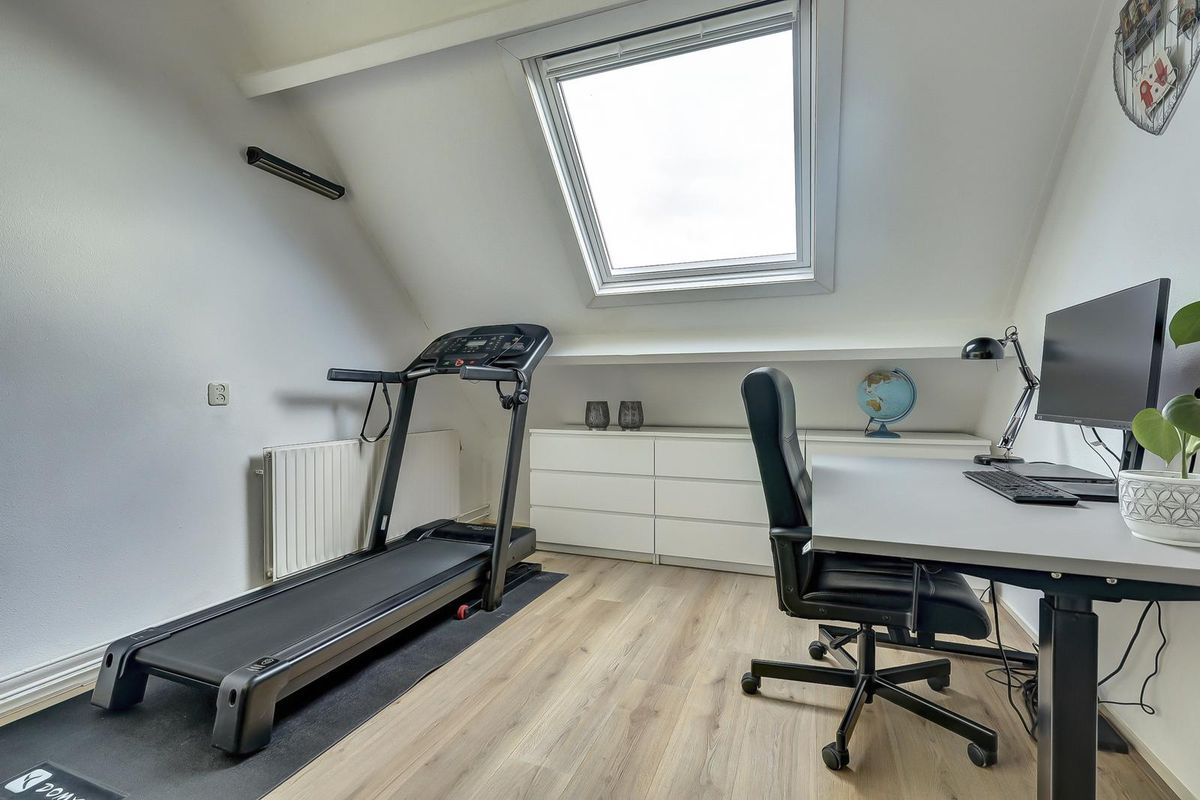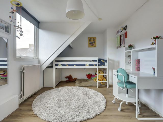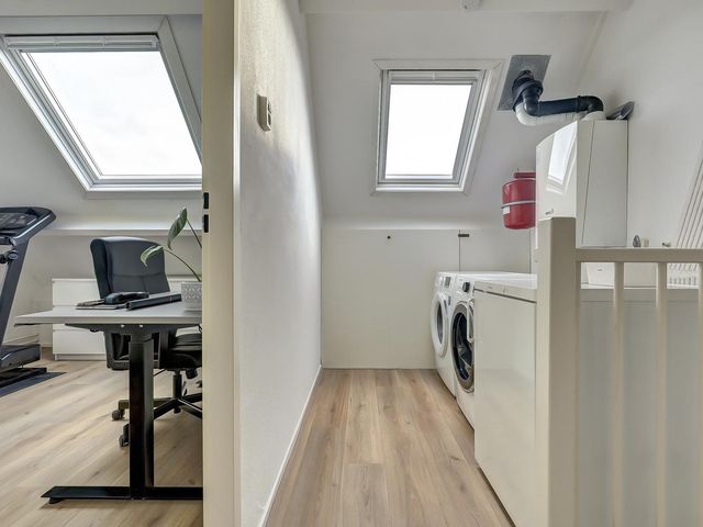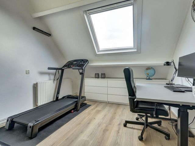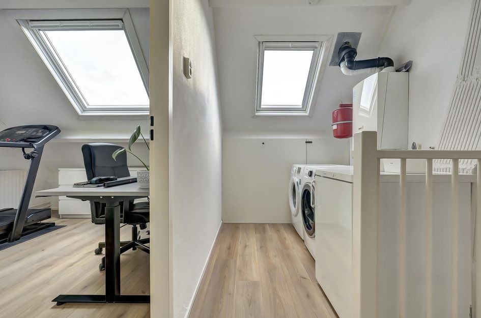 Op de tweede verdieping bevindt zich een ruime derde slaapkamer met dakraam en bergruimte achter de knieschotten. Deze ruimte is zeer geschikt als extra slaapkamer, sportruimte of hobbykamer. Daarnaast beschikt de overloop over een technische ruimte met de cv-installatie en aansluitingen voor wasapparatuur. Deze verdieping is keurig afgewerkt en biedt extra wooncomfort.