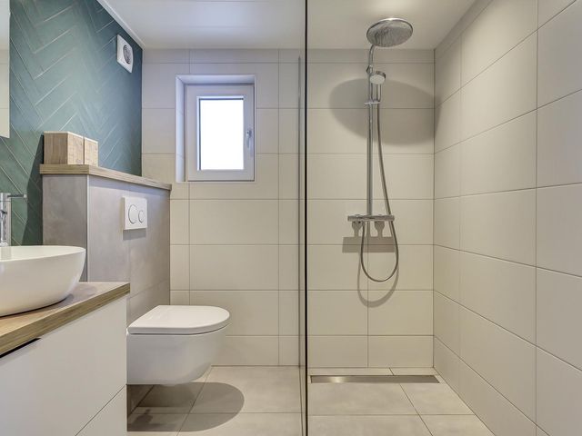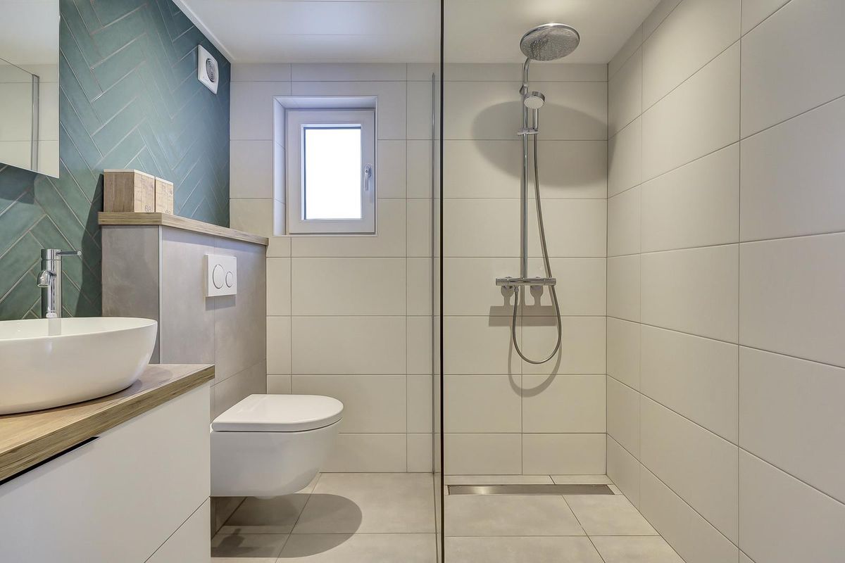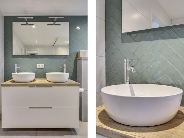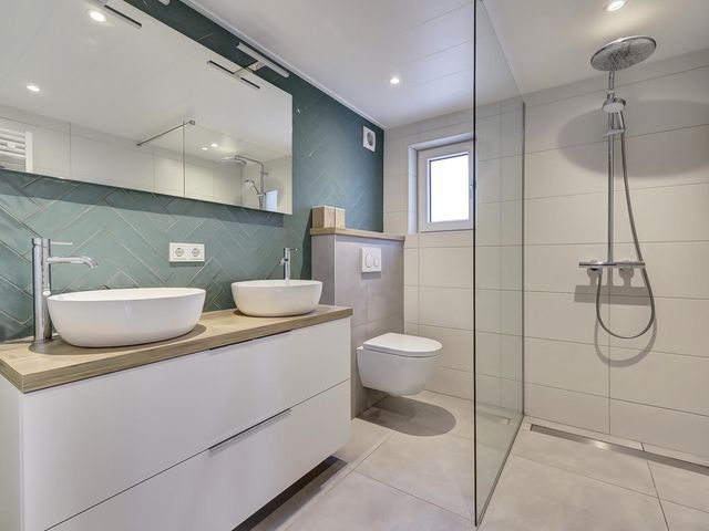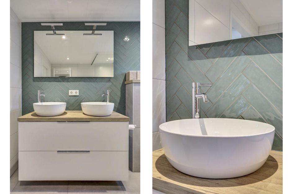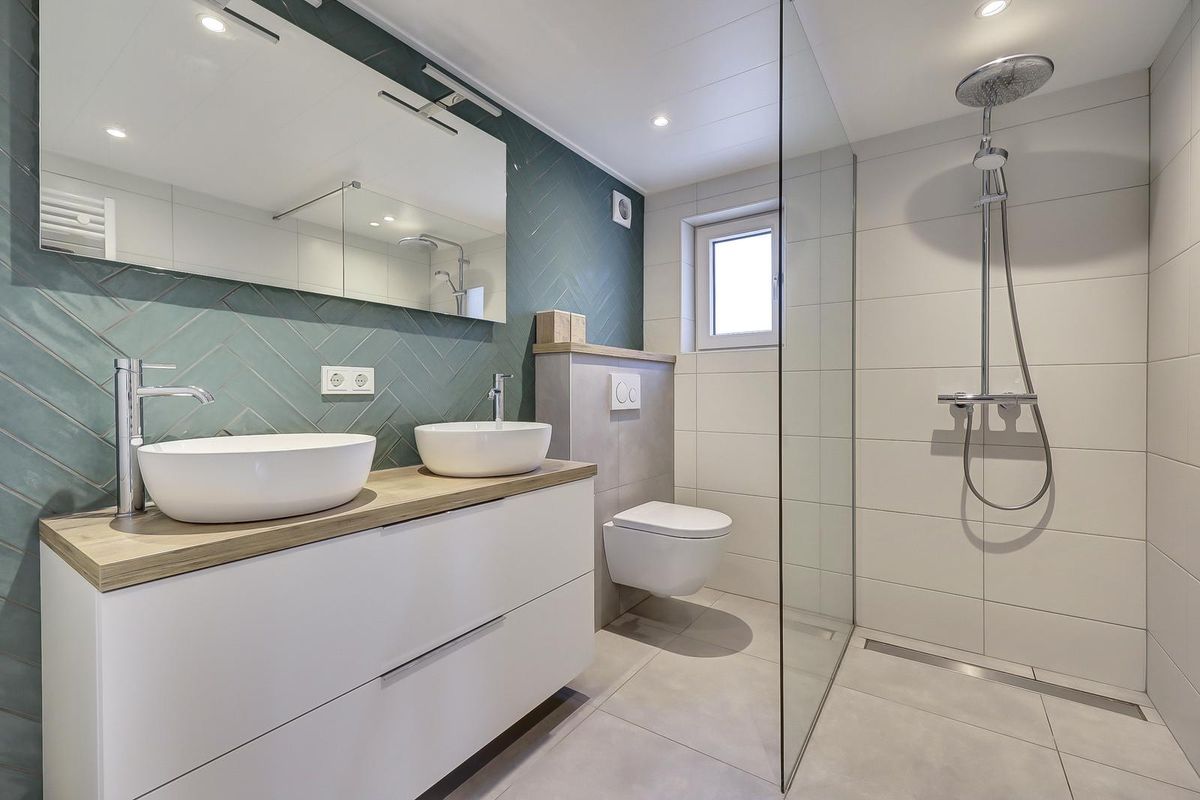 De badkamer is stijlvol en modern uitgevoerd met een inloopdouche, dubbele wastafel met meubel, toilet en een speelse wandafwerking met groene tint. De combinatie van witte tegels en houtaccenten zorgt voor een frisse, luxe uitstraling.