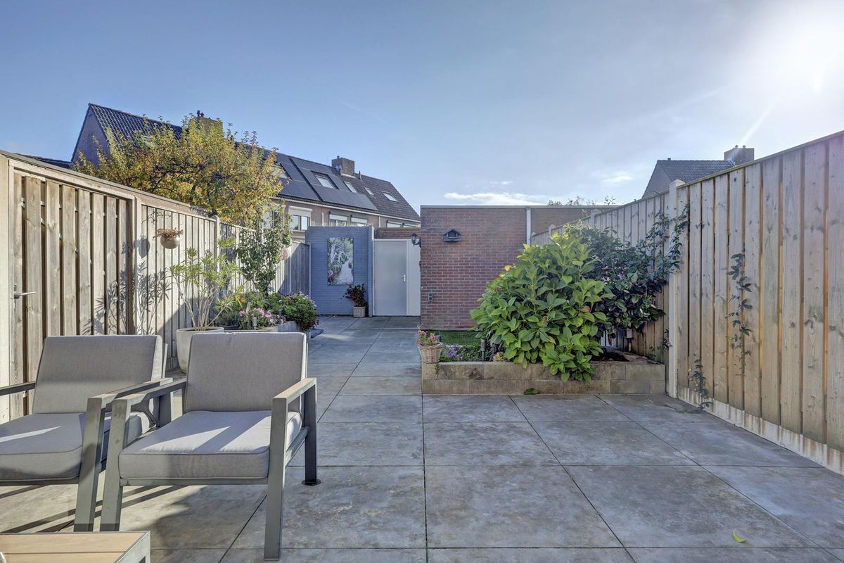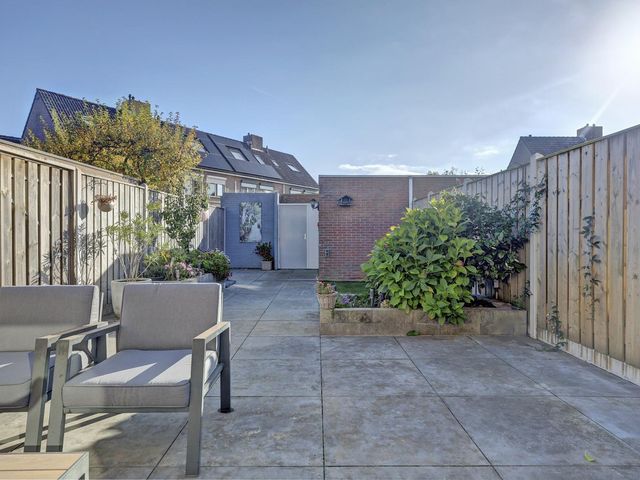 De achtertuin is onderhoudsvriendelijk en tegelijk sfeervol aangelegd met een ruim terras en enkele plantenborders. Dankzij de gunstige ligging is er veel zon, waardoor je hier optimaal kunt genieten van het buitenleven. Achterin de tuin bevindt zich een stenen berging, ideaal voor het opbergen van fietsen en tuingereedschap. Via een achterom, er zijn maar liefst twee poorten, is de tuin ook van buitenaf bereikbaar. De voortuin is verzorgd en voorzien van een klein terras.