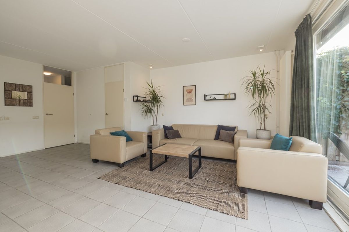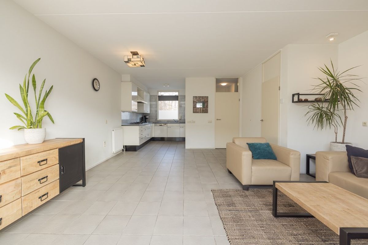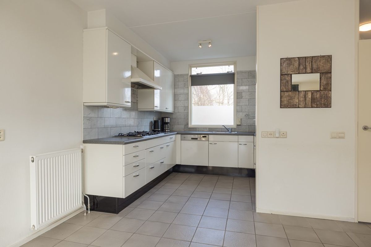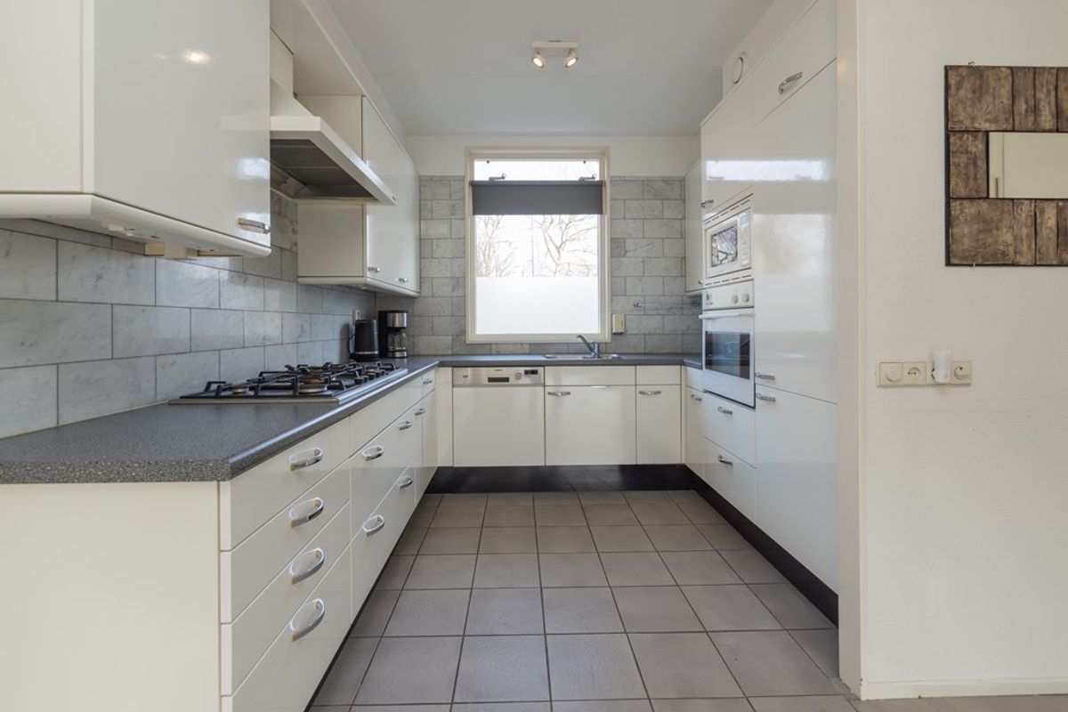 Entree, hal met de garderobe, de meterkast en de toiletruimte met een vrij hangend toilet. De aangenaam lichte en op de tuin gerichte woonkamer heeft een kast onder de trap en een schuifpui over de gehele breedte van de woning. De keuken is in lichte kleur uitgevoerd, is gelegen aan de voorzijde en is voorzien van diverse inbouwapparatuur zoals een 5-pits gaskookplaat met een wokbrander, een afzuigkap, een oven, een vaatwasser en een ingebouwde koel-/ vries combinatie.
