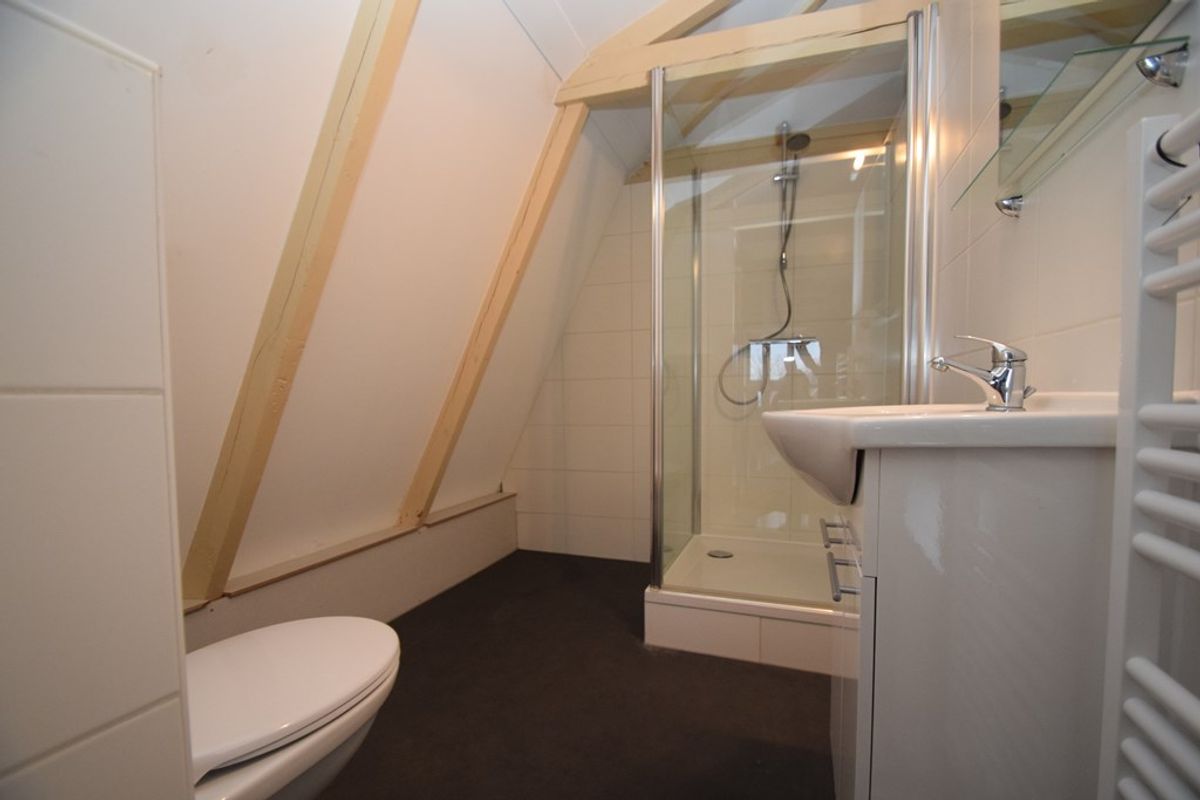 Trapopgang, ruime slaap(zolder), badkamer met douchecabine, wastafelmeubel en tweede toilet.