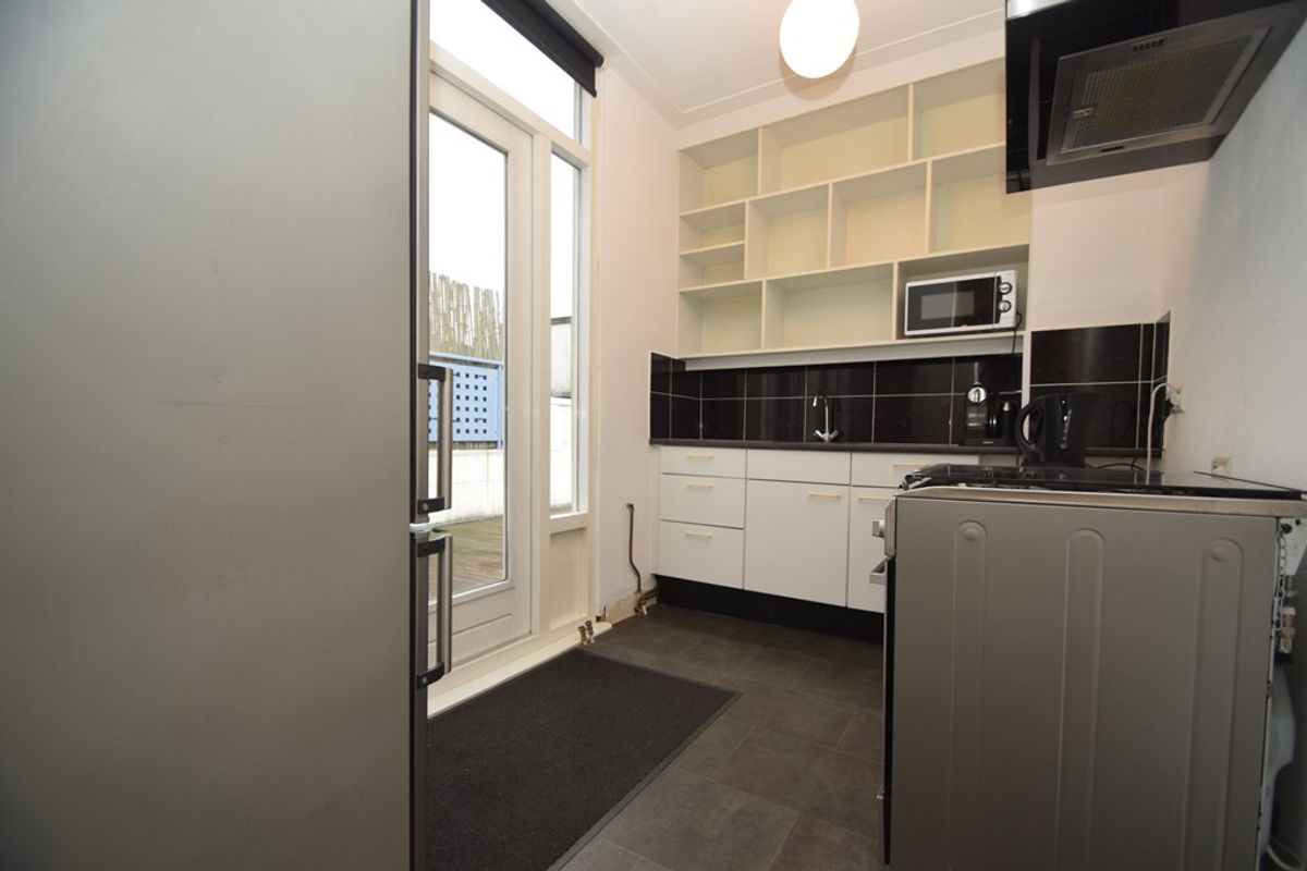 Trapopgang, hal met toegang tot de eerste badkamer en keuken, de badkamer is voorzien van de witgoedaansluiting, toilet en inloopdouche, de keuken is voorzien van diverse losse apparatuur en biedt toegang tot het dakterras, ruime woonkamer met toegang tot het dakterras.
