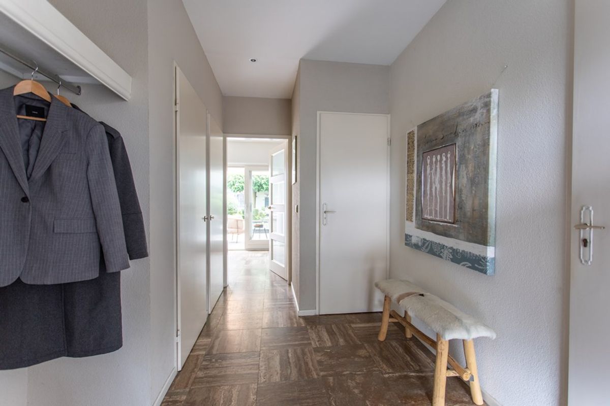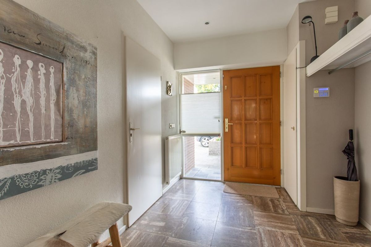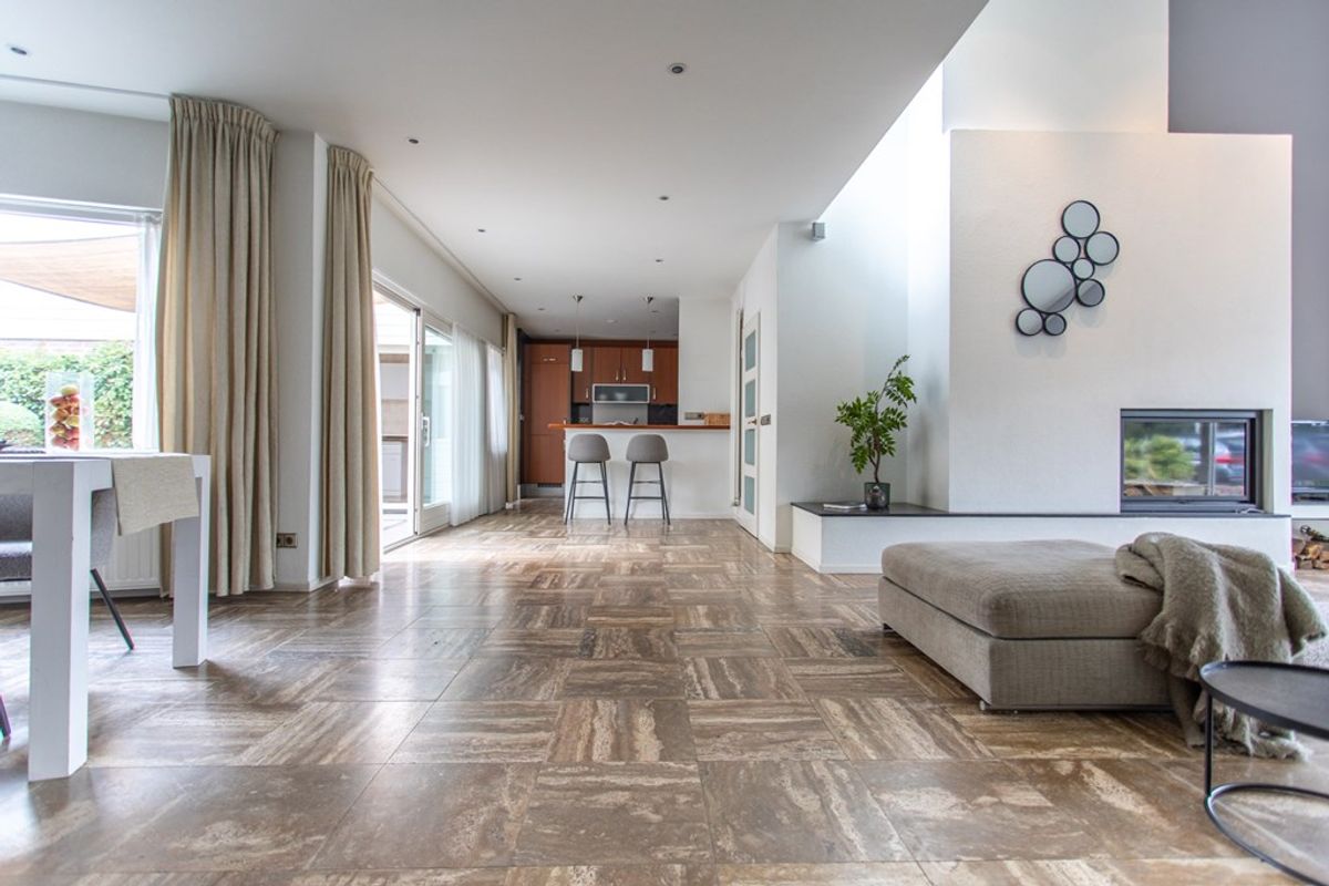Binnenkomen doet u in een ruime, verzorgde hal met natuursteenlook vloer, strakke inbouwkasten en een glasdeur naar de leefruimte. Direct valt de lichte, luchtige sfeer op: een royale living met hoog, deels schuin plafond, kamerhoge raampartijen en een schuifpui richting tuin.