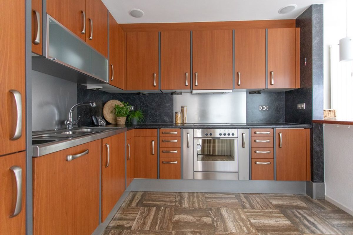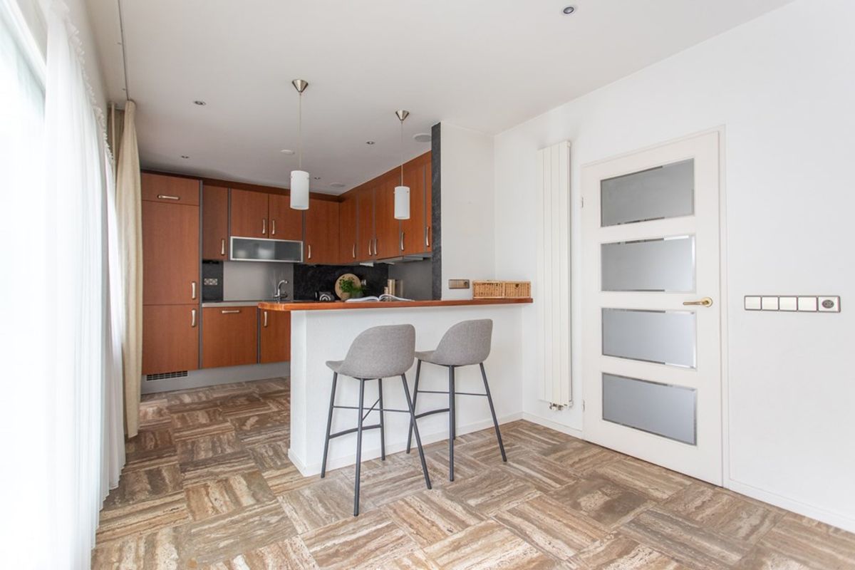 De open keuken heeft warme houtfronten, een donker werkblad, rvs‑accenten en baropstelling met hanglampen; praktisch ingericht met o.a. inbouwoven, keramische kookplaat, spoelbak, onderkastverlichting en veel bergruimte. Alles oogt degelijk, tijdloos en goed onderhouden.