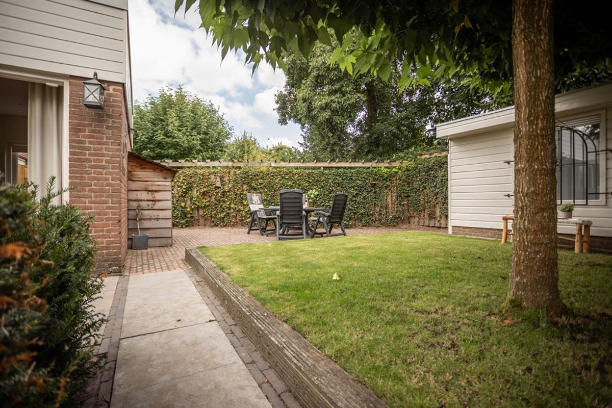 Er is een vrijstaand tuinhuis/berging met nette horizontale gevelbekleding en siertralies plus een overdekte houtopslag; de erfafscheidingen en het schilderwerk zijn verzorgd. De tuin ademt rust en kwaliteit en biedt op elk moment van de dag een fijne zitplek.