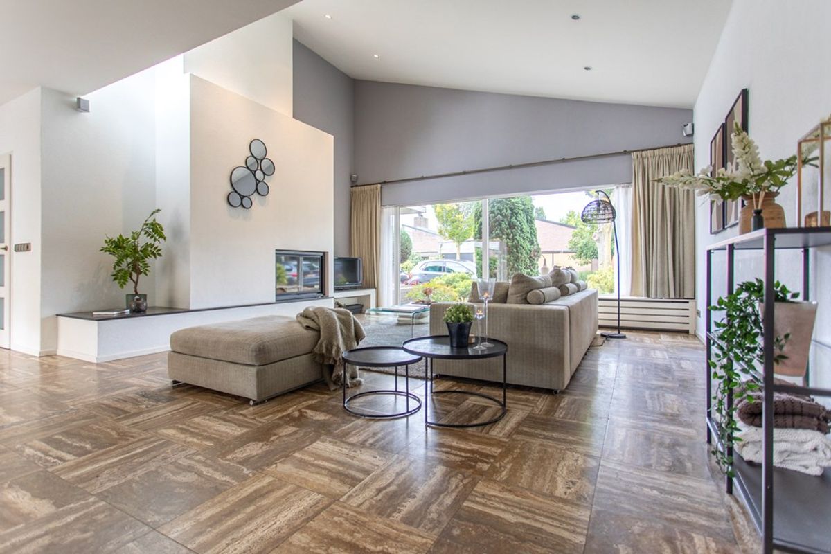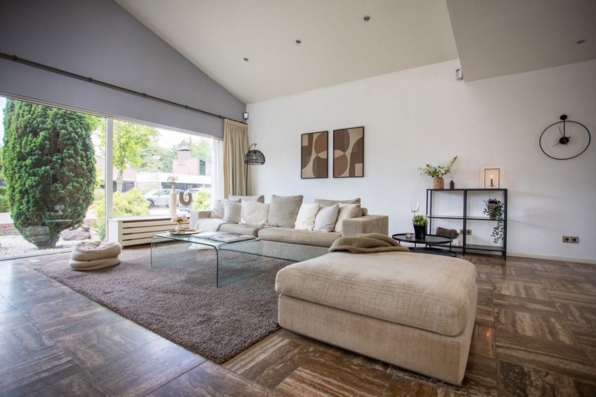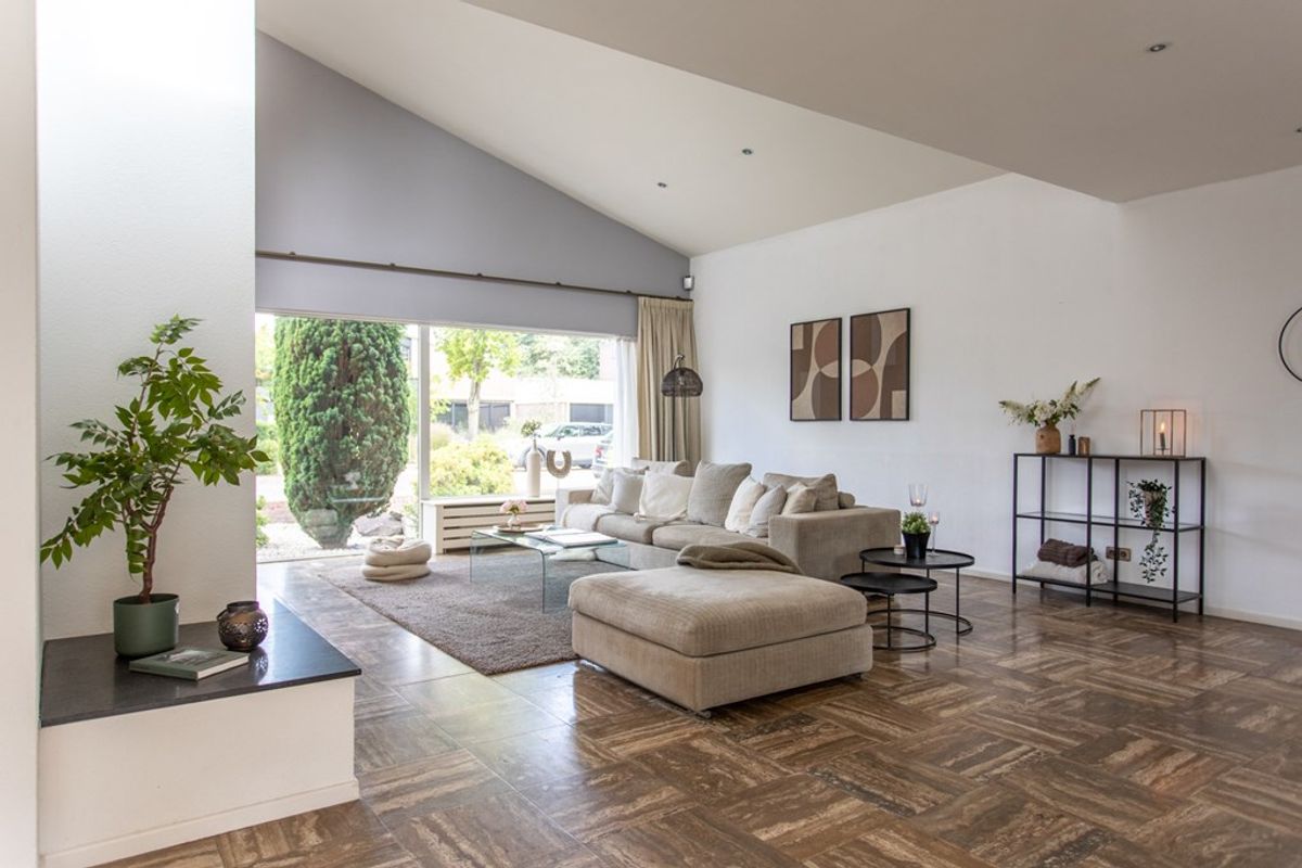 - Lichte living met hoog, deels schuin plafond, inbouwspots en grote raampartijen