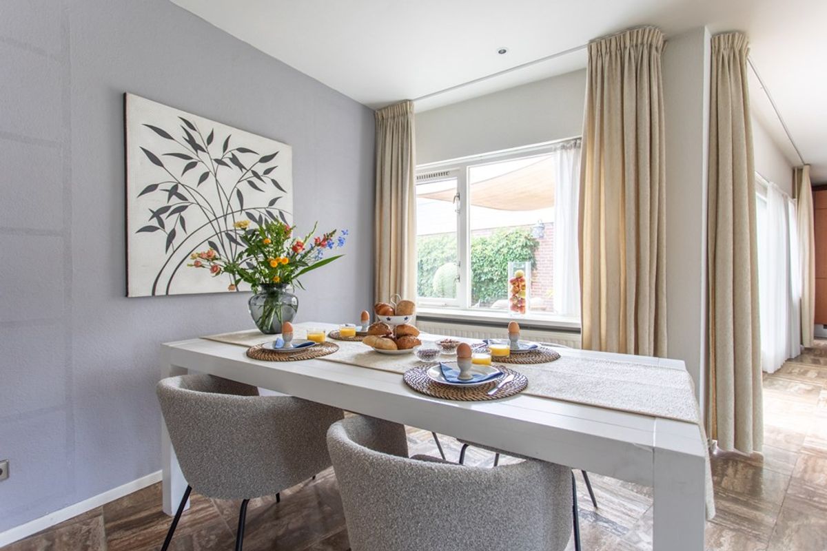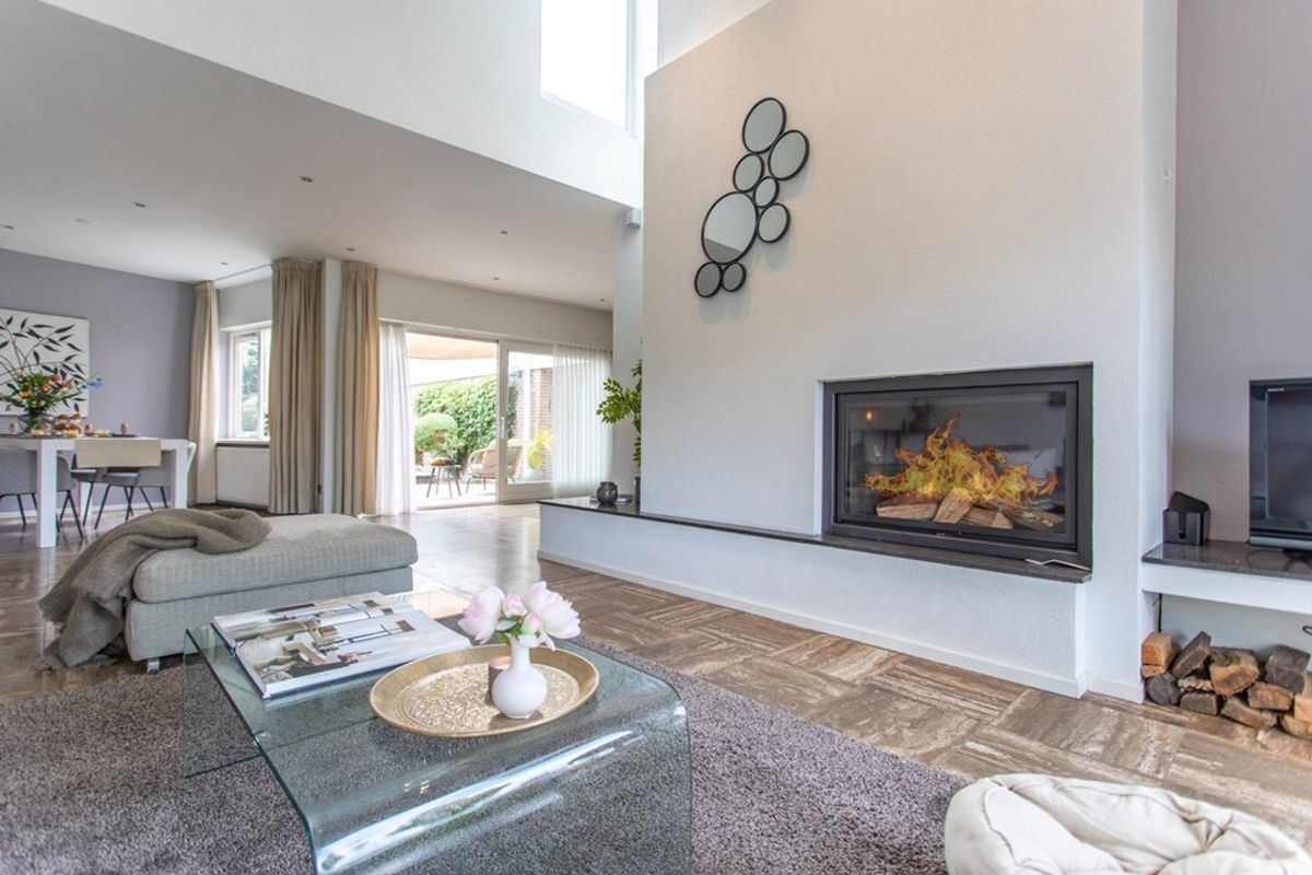 De zithoek wordt geankerd door een strakke inbouwhaard met haardbank en maatwerkplateaus; de afwerking is modern en neutraal met inbouwspots en een fraaie radiatorombouw. Aansluitend ligt de eetkamer aan de tuinzijde met grote pui en lange gordijnen voor een hotelwaardige sfeer.