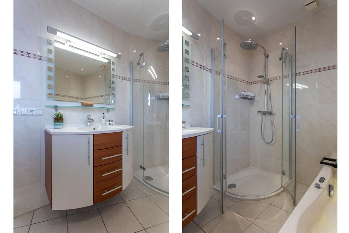The bathroom is both comfortable and spacious: a modern shower with clear glass and rain shower, a whirlpool bath with lighting, and a sleek vanity unit with large mirror and lighting. Fully tiled in light, neutral shades, it offers a calm and relaxing atmosphere.