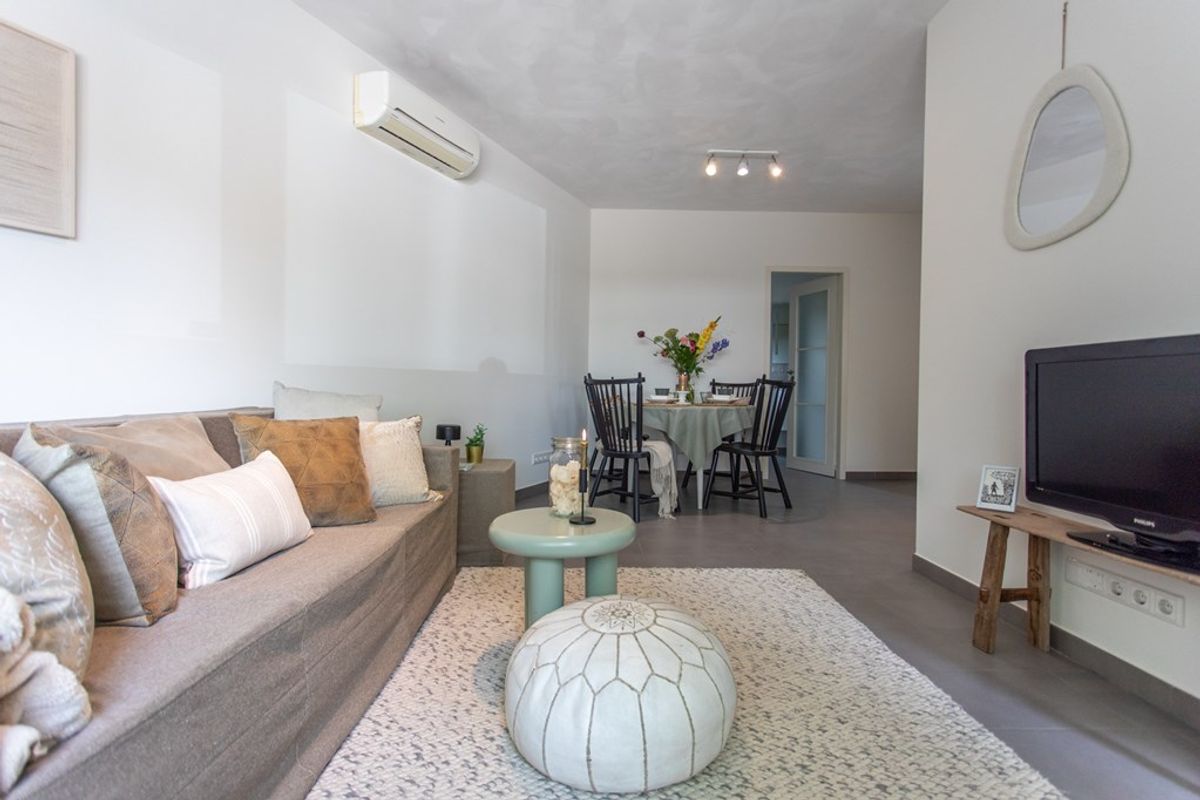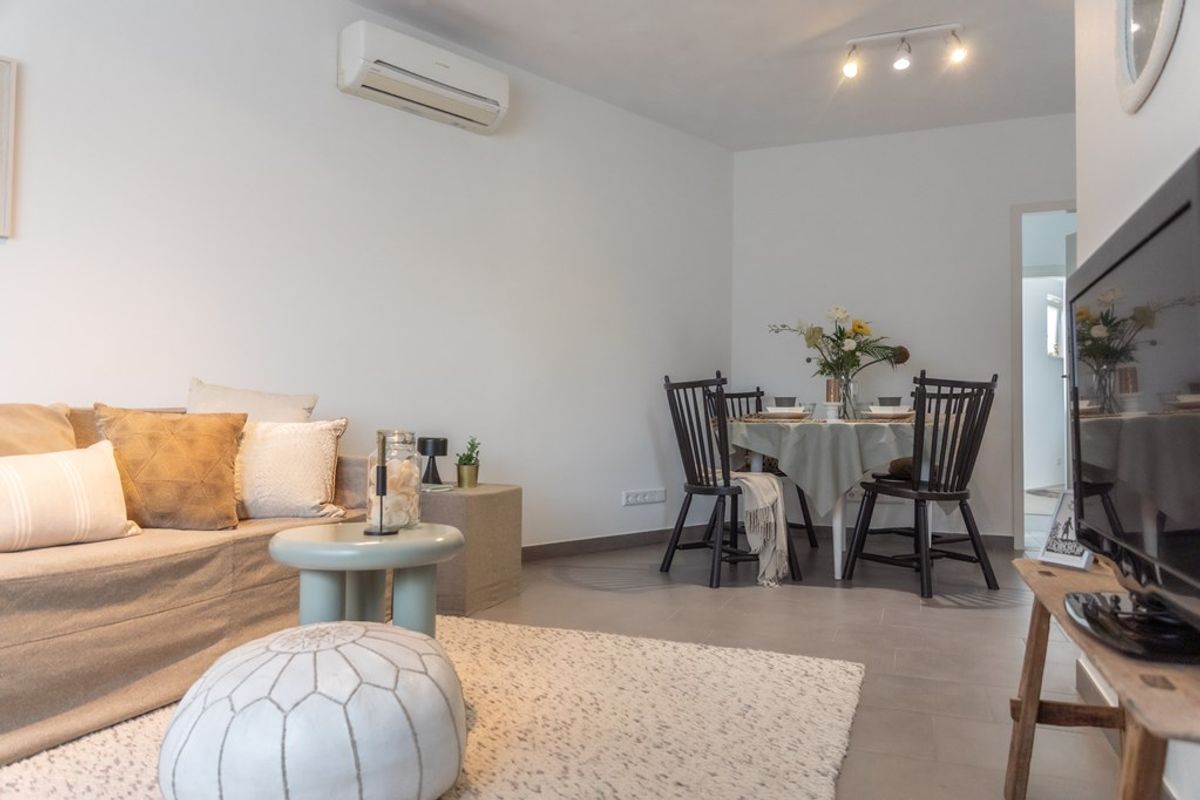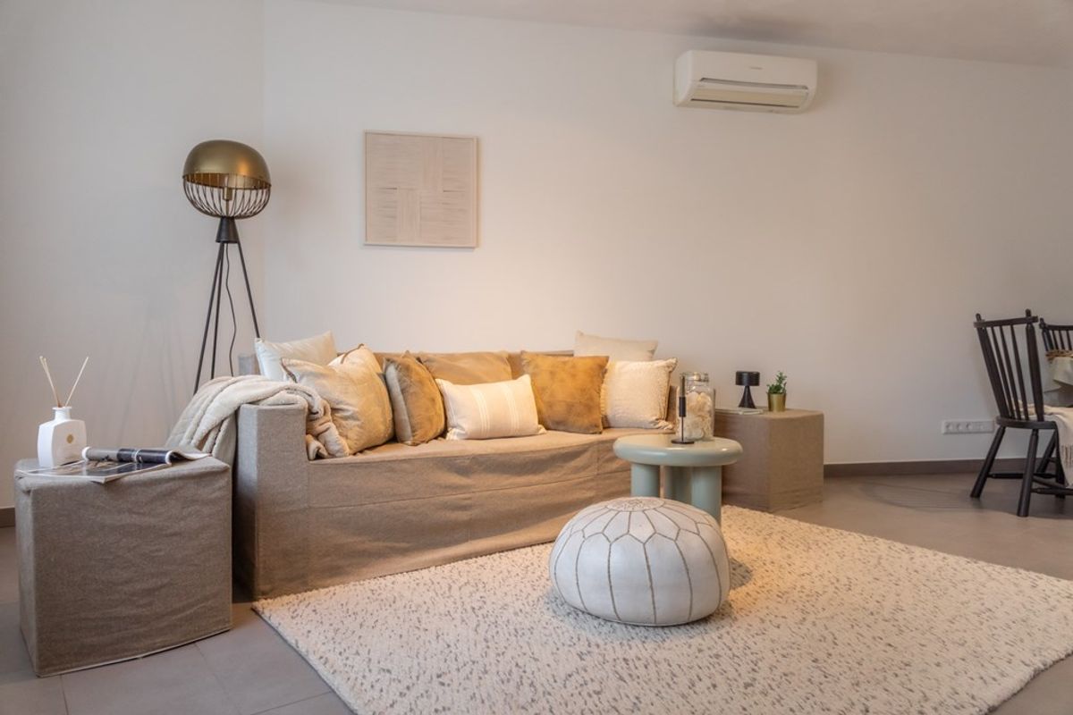 The living room is an open and inviting space with continuous large-format ceramic floor tiles in gray, smooth plastered walls, and a ceiling with spot rails. The wide windows allow plenty of natural light, creating a calm atmosphere, while textile accents and the refined finish make the space warm and welcoming. A wall-mounted split air conditioner provides extra comfort on hot days. Adjacent is the dining area with views of the semi-open kitchen: compact and well-kept, featuring glossy white cabinets, a dark tiled backsplash, under-cabinet lighting, and a dark countertop with pre-installed connections for a cooktop. Perfect for efficient cooking without losing space.